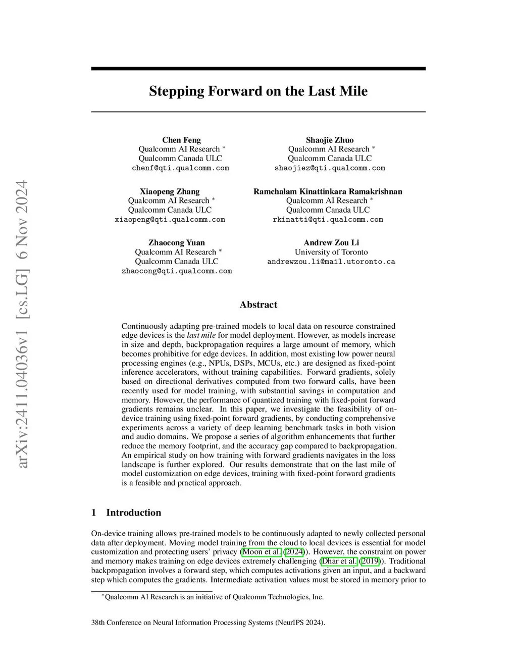 Continuously adapting pre-trained models to local data on resource constrained edge devices is the for model deployment. However, as models increase in size and depth, backpropagation requires a large amount of memory, which becomes prohibitive for edge devices. In addition, most existing low power neural processing engines (e.g., NPUs, DSPs, MCUs, etc.) are designed as fixed-point inference accelerators, without training capabilities. Forward gradients, solely based on directional derivatives computed from two forward calls, have been recently used for model training, with substantial savings in computation and memory. However, the performance of quantized training with fixed-point forward gradients remains unclear. In this paper, we investigate the feasibility of on-device training using fixed-point forward gradients, by conducting comprehensive experiments across a variety of deep learning benchmark tasks in both vision and audio domains. We propose a series of algorithm enhancements that further reduce the memory footprint, and the accuracy gap compared to backpropagation. An empirical study on how training with forward gradients navigates in the loss landscape is further explored. Our results demonstrate that on the last mile of model customization on edge devices, training with fixed-point forward gradients is a feasible and practical approach.