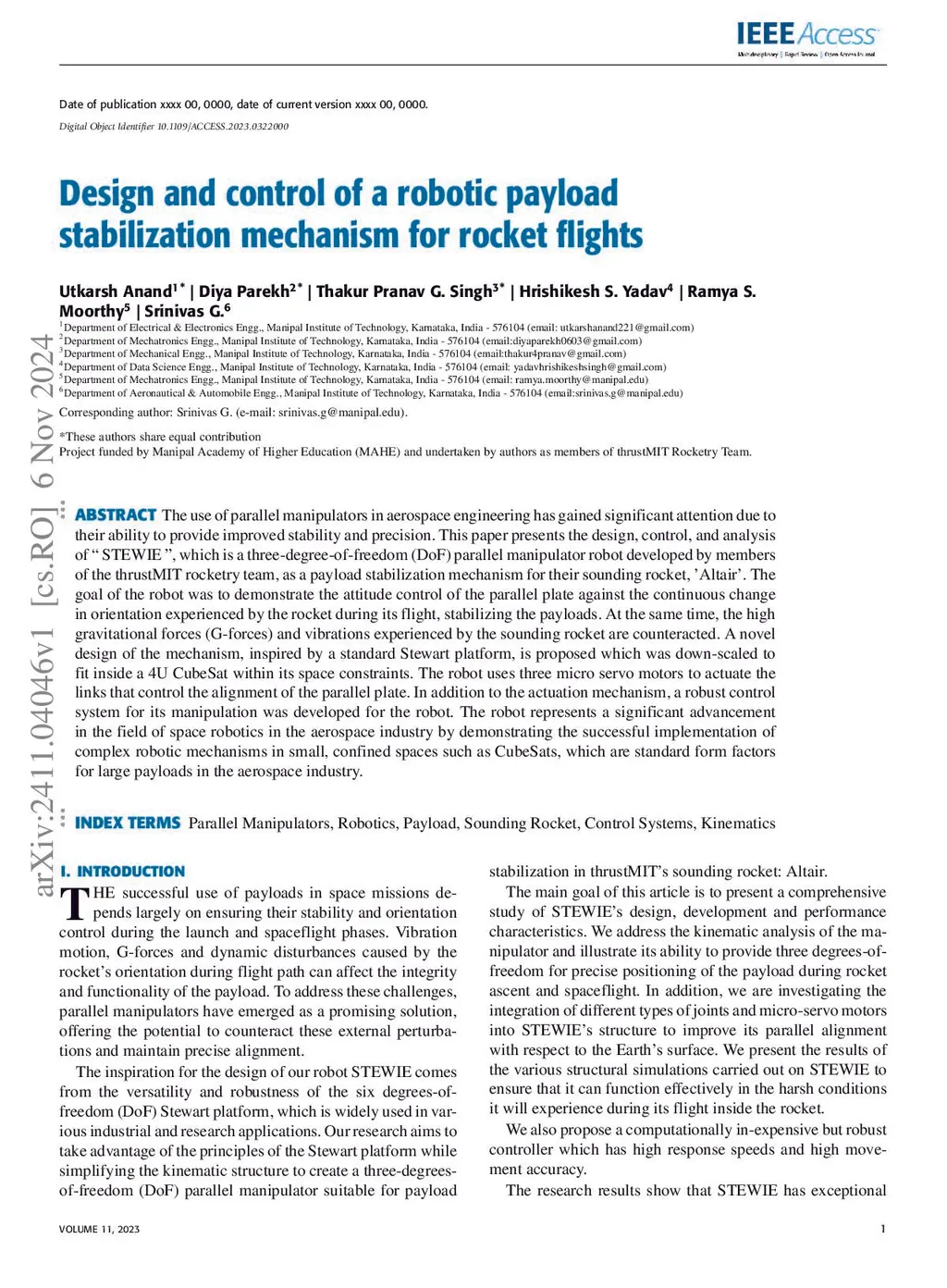 The use of parallel manipulators in aerospace engineering has gained significant attention due to their ability to provide improved stability and precision. This paper presents the design, control, and analysis of 'STEWIE', which is a three-degree-of-freedom (DoF) parallel manipulator robot developed by members of the thrustMIT rocketry team, as a payload stabilization mechanism for their sounding rocket, Áltair'. The goal of the robot was to demonstrate the attitude control of the parallel plate against the continuous change in orientation experienced by the rocket during its flight, stabilizing the payloads. At the same time, the high gravitational forces (G-forces) and vibrations experienced by the sounding rocket are counteracted. A novel design of the mechanism, inspired by a standard Stewart platform, is proposed which was down-scaled to fit inside a 4U CubeSat within its space constraints. The robot uses three micro servo motors to actuate the links that control the alignment of the parallel plate. In addition to the actuation mechanism, a robust control system for its manipulation was developed for the robot. The robot represents a significant advancement in the field of space robotics in the aerospace industry by demonstrating the successful implementation of complex robotic mechanisms in small, confined spaces such as CubeSats, which are standard form factors for large payloads in the aerospace industry.