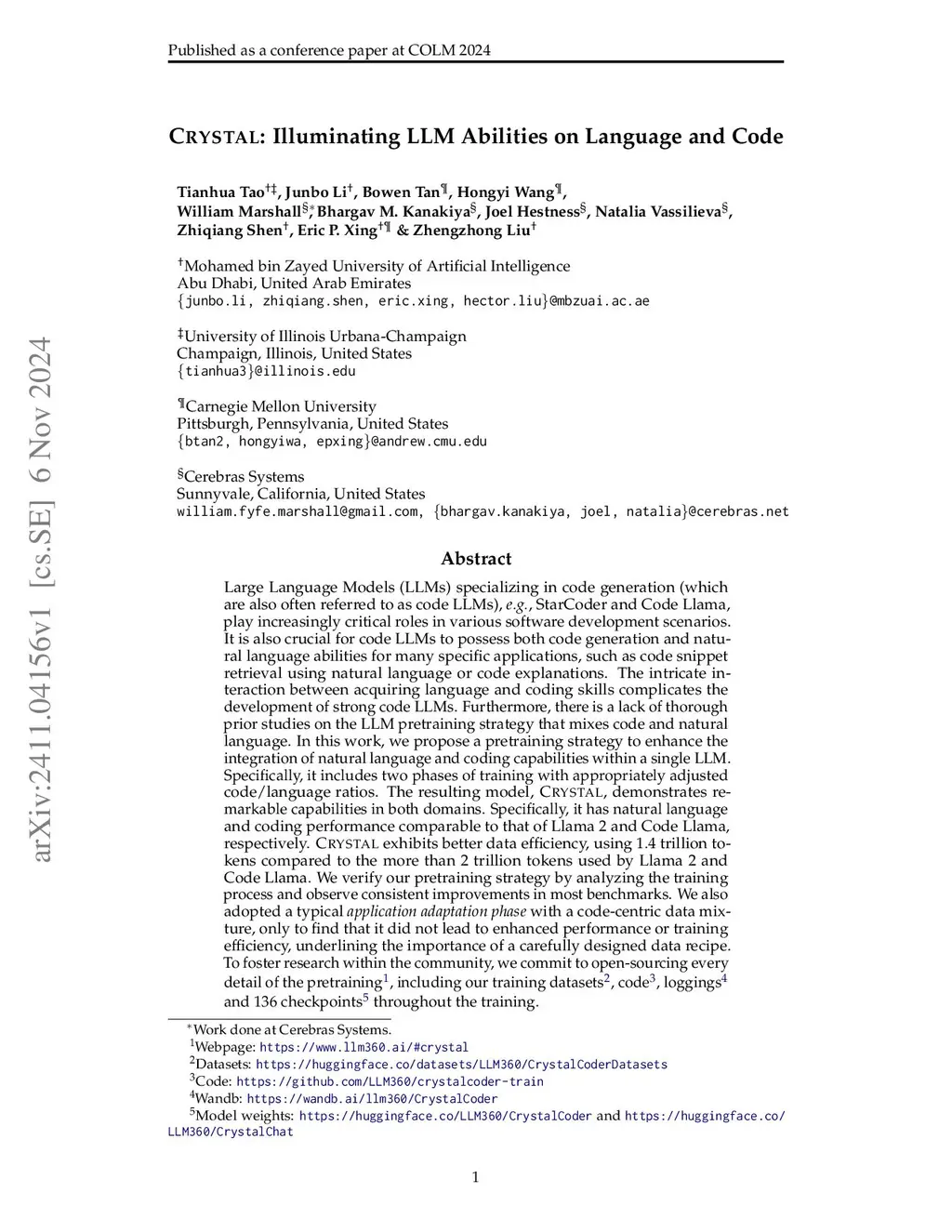 Large Language Models (LLMs) specializing in code generation (which are also often referred to as code LLMs), e.g., StarCoder and Code Llama, play increasingly critical roles in various software development scenarios. It is also crucial for code LLMs to possess both code generation and natural language abilities for many specific applications, such as code snippet retrieval using natural language or code explanations. The intricate interaction between acquiring language and coding skills complicates the development of strong code LLMs. Furthermore, there is a lack of thorough prior studies on the LLM pretraining strategy that mixes code and natural language. In this work, we propose a pretraining strategy to enhance the integration of natural language and coding capabilities within a single LLM. Specifically, it includes two phases of training with appropriately adjusted code/language ratios. The resulting model, Crystal, demonstrates remarkable capabilities in both domains. Specifically, it has natural language and coding performance comparable to that of Llama 2 and Code Llama, respectively. Crystal exhibits better data efficiency, using 1.4 trillion tokens compared to the more than 2 trillion tokens used by Llama 2 and Code Llama. We verify our pretraining strategy by analyzing the training process and observe consistent improvements in most benchmarks. We also adopted a typical application adaptation phase with a code-centric data mixture, only to find that it did not lead to enhanced performance or training efficiency, underlining the importance of a carefully designed data recipe. To foster research within the community, we commit to open-sourcing every detail of the pretraining, including our training datasets, code, loggings and 136 checkpoints throughout the training.