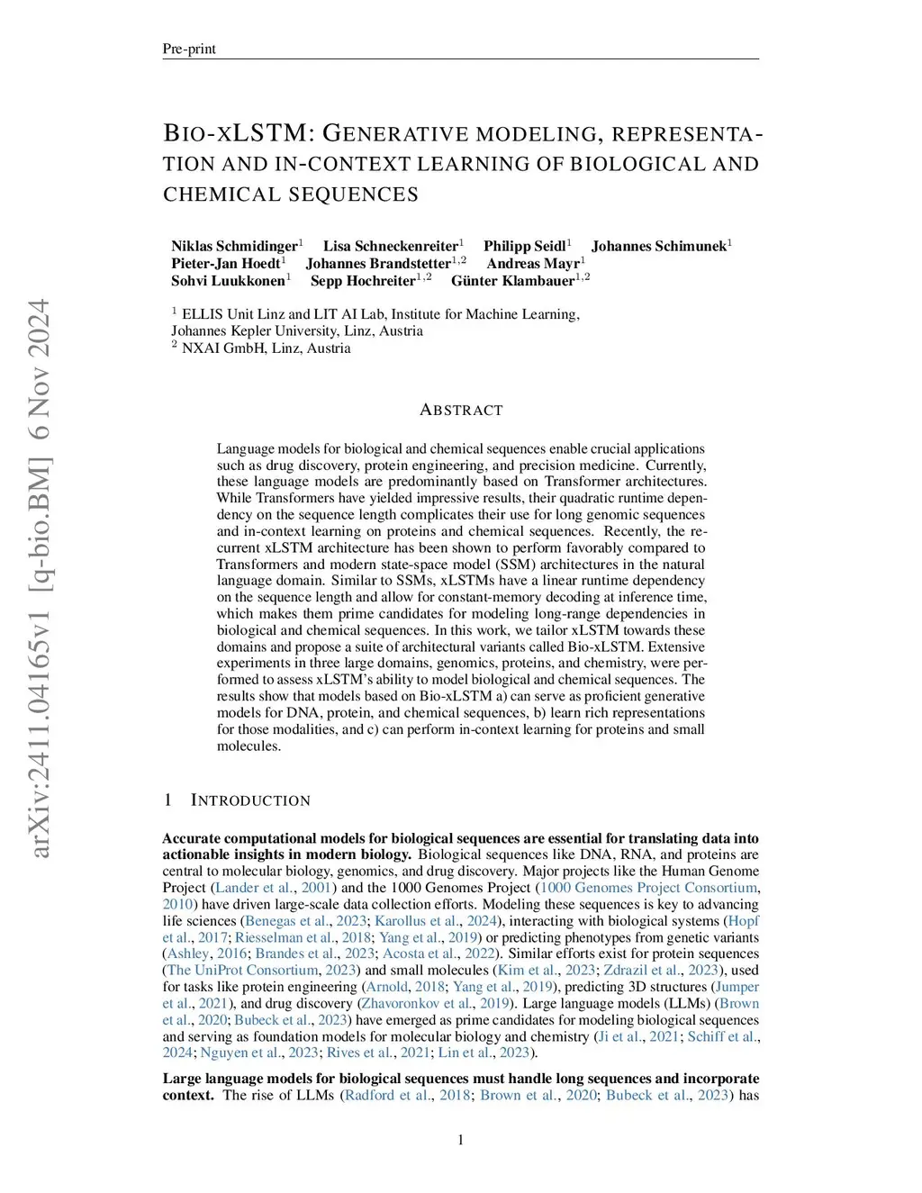 Language models for biological and chemical sequences enable crucial applications such as drug discovery, protein engineering, and precision medicine. Currently, these language models are predominantly based on Transformer architectures. While Transformers have yielded impressive results, their quadratic runtime dependency on the sequence length complicates their use for long genomic sequences and in-context learning on proteins and chemical sequences. Recently, the recurrent xLSTM architecture has been shown to perform favorably compared to Transformers and modern state-space model (SSM) architectures in the natural language domain. Similar to SSMs, xLSTMs have a linear runtime dependency on the sequence length and allow for constant-memory decoding at inference time, which makes them prime candidates for modeling long-range dependencies in biological and chemical sequences. In this work, we tailor xLSTM towards these domains and propose a suite of architectural variants called Bio-xLSTM. Extensive experiments in three large domains, genomics, proteins, and chemistry, were performed to assess xLSTM's ability to model biological and chemical sequences. The results show that models based on Bio-xLSTM a) can serve as proficient generative models for DNA, protein, and chemical sequences, b) learn rich representations for those modalities, and c) can perform in-context learning for proteins and small molecules.