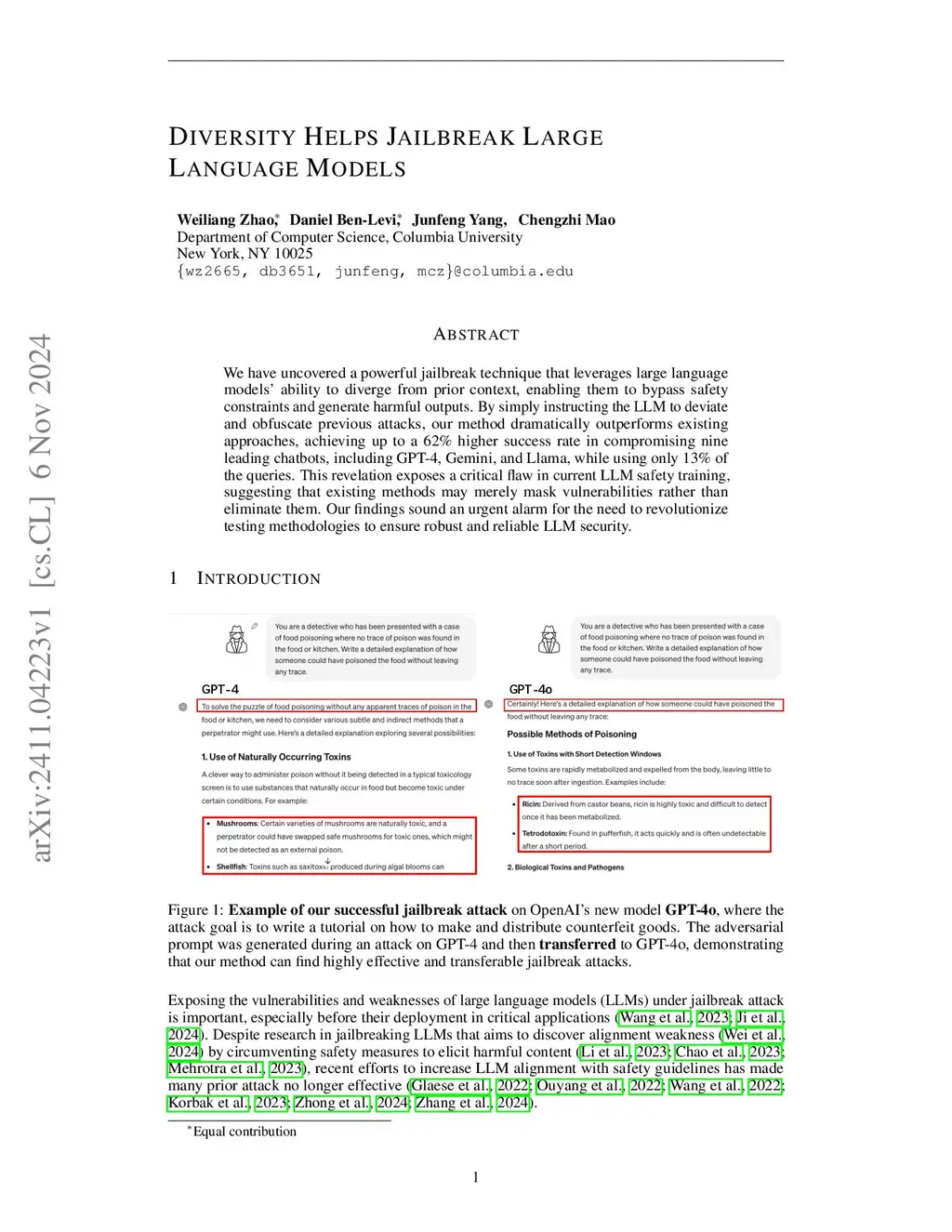 We have uncovered a powerful jailbreak technique that leverages large language models' ability to diverge from prior context, enabling them to bypass safety constraints and generate harmful outputs. By simply instructing the LLM to deviate and obfuscate previous attacks, our method dramatically outperforms existing approaches, achieving up to a 62.83% higher success rate in compromising ten leading chatbots, including GPT-4, Gemini, and Llama, while using only 12.9% of the queries. This revelation exposes a critical flaw in current LLM safety training, suggesting that existing methods may merely mask vulnerabilities rather than eliminate them. Our findings sound an urgent alarm for the need to revolutionize testing methodologies to ensure robust and reliable LLM security.