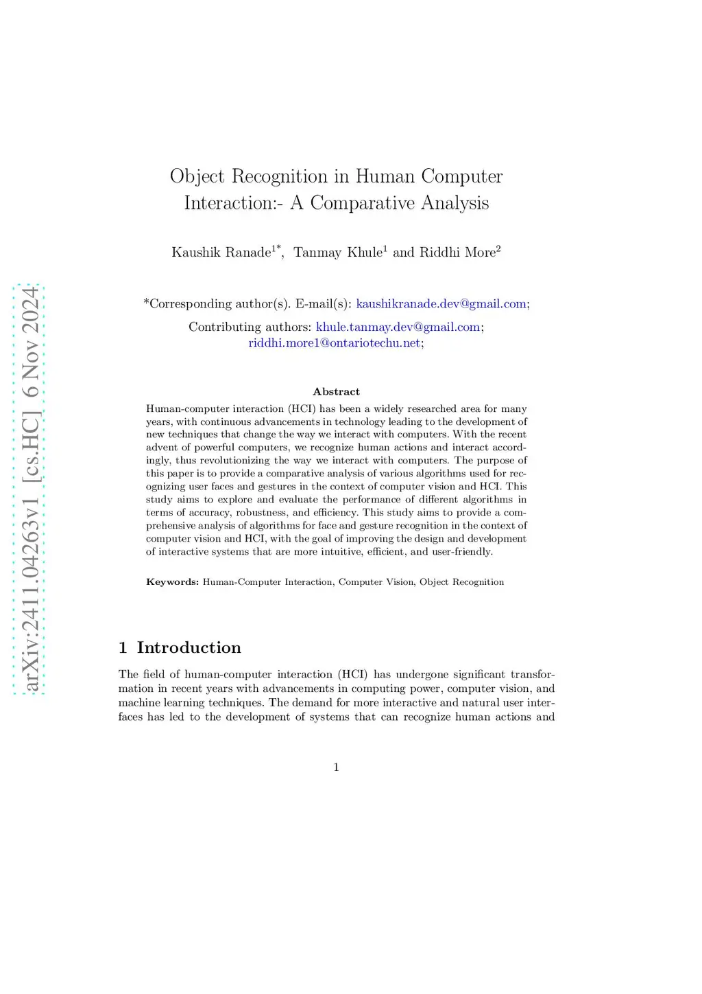 Object Recognition in Human Computer Interaction:- A Comparative