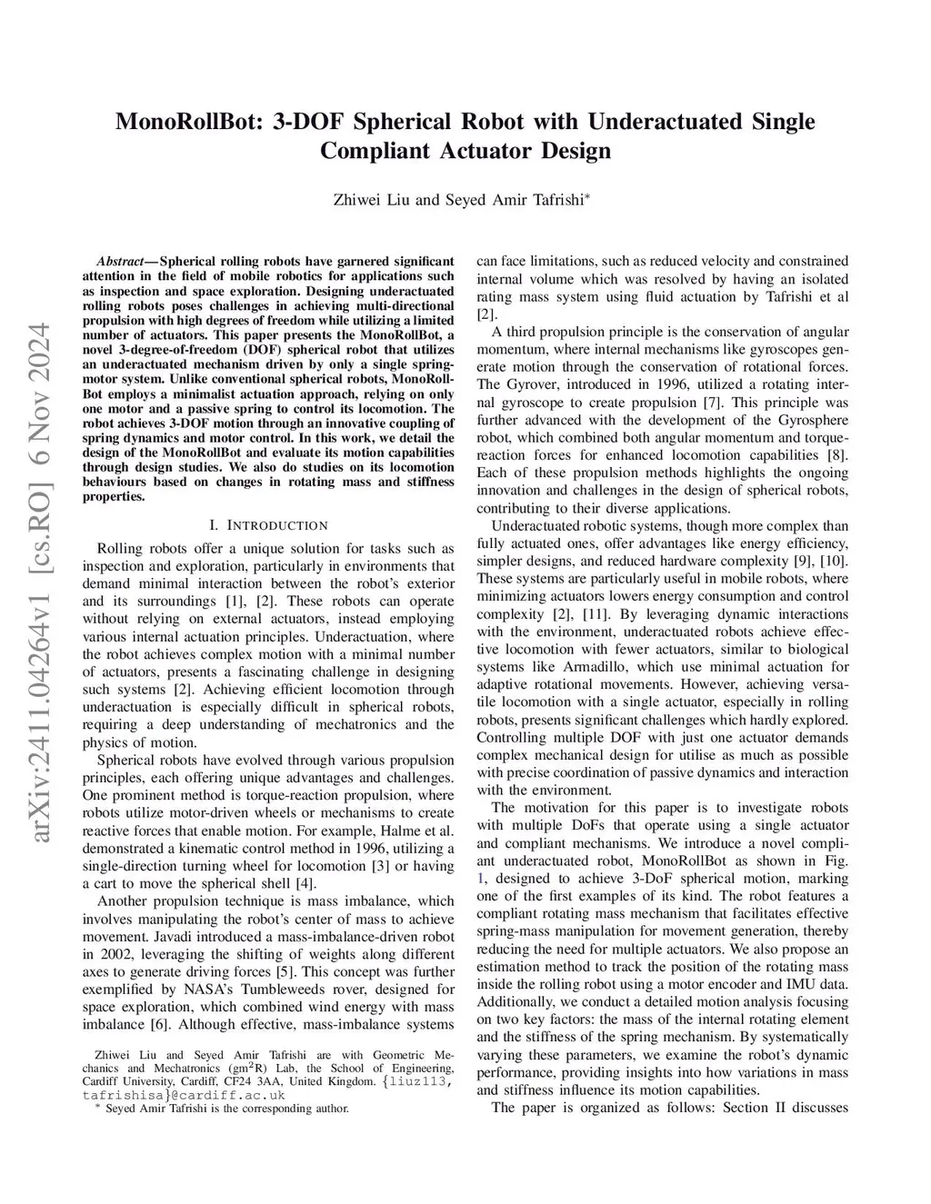 MonoRollBot: 3-DOF Spherical Robot with Underactuated Single Compliant Actuator Design