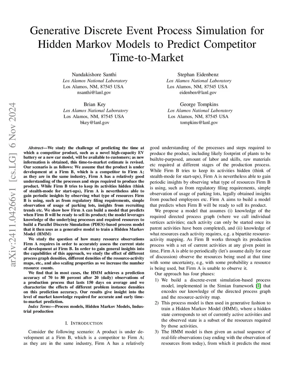 We study the challenge of predicting the time at which a competitor product, such as a novel high-capacity EV battery or a new car model, will be available to customers; as new information is obtained, this time-to-market estimate is revised. Our scenario is as follows: We assume that the product is under development at a Firm B, which is a competitor to Firm A; as they are in the same industry, Firm A has a relatively good understanding of the processes and steps required to produce the product. While Firm B tries to keep its activities hidden (think of stealth-mode for start-ups), Firm A is nevertheless able to gain periodic insights by observing what type of resources Firm B is using. We show how Firm A can build a model that predicts when Firm B will be ready to sell its product; the model leverages knowledge of the underlying processes and required resources to build a Parallel Discrete Simulation (PDES)-based process model that it then uses as a generative model to train a Hidden Markov Model (HMM). We study the question of how many resource observations Firm A requires in order to accurately assess the current state of development at Firm B. In order to gain general insights into the capabilities of this approach, we study the effect of different process graph densities, different densities of the resource-activity maps, etc., and also scaling properties as we increase the number resource counts. We find that in most cases, the HMM achieves a prediction accuracy of 70 to 80 percent after 20 (daily) observations of a production process that lasts 150 days on average and we characterize the effects of different problem instance densities on this prediction accuracy. Our results give insight into the level of market knowledge required for accurate and early time-to-market prediction.