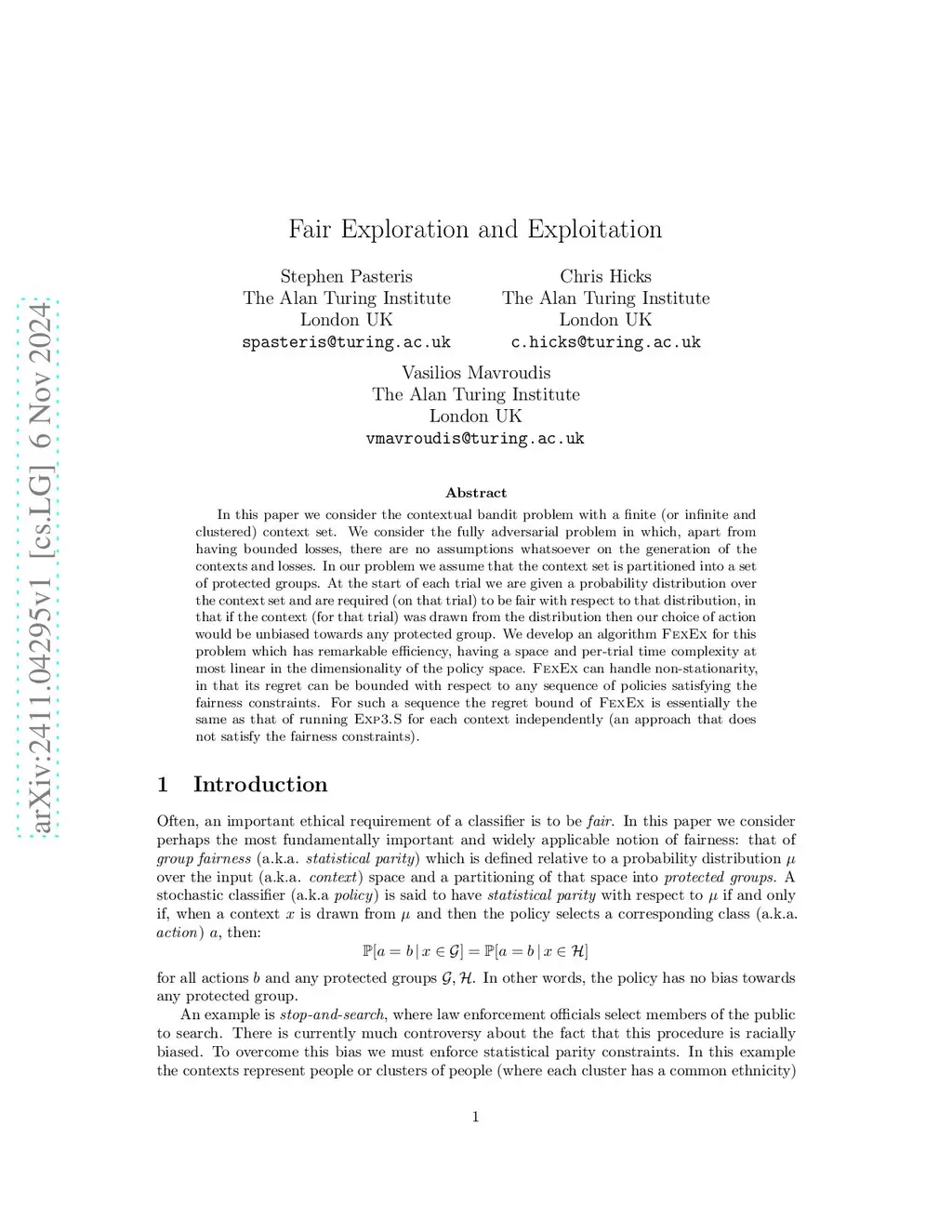 In this paper we consider the contextual bandit problem with a finite (or infinite and clustered) context set. We consider the fully adversarial problem in which, apart from having bounded losses, there are no assumptions whatsoever on the generation of the contexts and losses. In our problem we assume that the context set is partitioned into a set of protected groups. At the start of each trial we are given a probability distribution over the context set and are required (on that trial) to be fair with respect to that distribution, in that if the context (for that trial) was drawn from the distribution then our choice of action would be unbiased towards any protected group. We develop an algorithm FexEx for this problem which has remarkable efficiency, having a space and per-trial time complexity at most linear in the dimensionality of the policy space. FexEx can handle non-stationarity, in that its regret can be bounded with respect to any sequence of policies satisfying the fairness constraints. For such a sequence the regret bound of FexEx is essentially the same as that of running Exp3.S for each context independently (an approach that does not satisfy the fairness constraints).