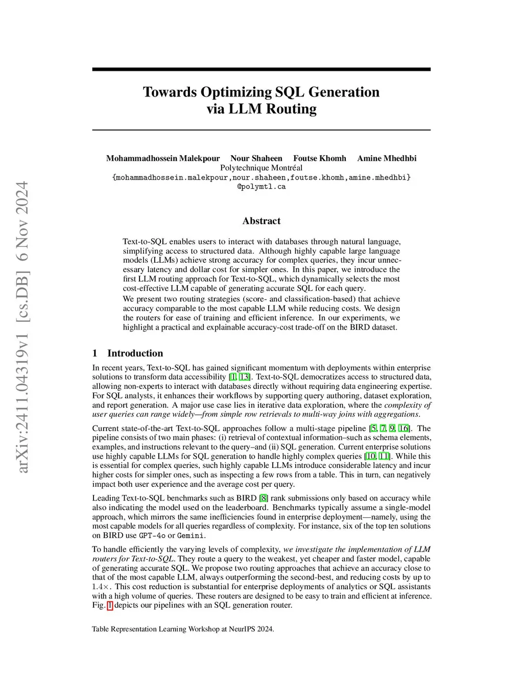 Text-to-SQL enables users to interact with databases through natural language, simplifying access to structured data. Although highly capable large language models (LLMs) achieve strong accuracy for complex queries, they incur unnecessary latency and dollar cost for simpler ones. In this paper, we introduce the first LLM routing approach for Text-to-SQL, which dynamically selects the most cost-effective LLM capable of generating accurate SQL for each query. We present two routing strategies (score- and classification-based) that achieve accuracy comparable to the most capable LLM while reducing costs. We design the routers for ease of training and efficient inference. In our experiments, we highlight a practical and explainable accuracy-cost trade-off on the BIRD dataset.