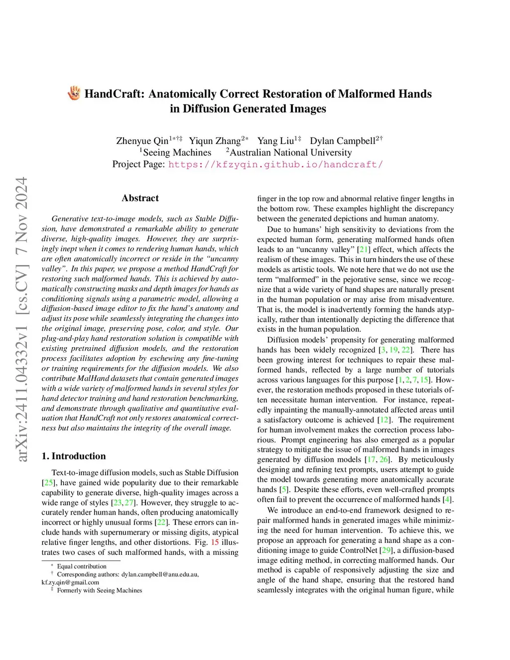 Generative text-to-image models, such as Stable Diffusion, have demonstrated a remarkable ability to generate diverse, high-quality images. However, they are surprisingly inept when it comes to rendering human hands, which are often anatomically incorrect or reside in the "uncanny valley". In this paper, we propose a method HandCraft for restoring such malformed hands. This is achieved by automatically constructing masks and depth images for hands as conditioning signals using a parametric model, allowing a diffusion-based image editor to fix the hand's anatomy and adjust its pose while seamlessly integrating the changes into the original image, preserving pose, color, and style. Our plug-and-play hand restoration solution is compatible with existing pretrained diffusion models, and the restoration process facilitates adoption by eschewing any fine-tuning or training requirements for the diffusion models. We also contribute MalHand datasets that contain generated images with a wide variety of malformed hands in several styles for hand detector training and hand restoration benchmarking, and demonstrate through qualitative and quantitative evaluation that HandCraft not only restores anatomical correctness but also maintains the integrity of the overall image.