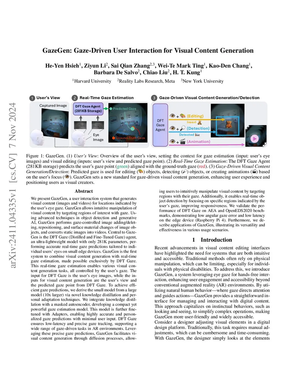 We present GazeGen, a user interaction system that generates visual content (images and videos) for locations indicated by the user's eye gaze. GazeGen allows intuitive manipulation of visual content by targeting regions of interest with gaze. Using advanced techniques in object detection and generative AI, GazeGen performs gaze-controlled image adding/deleting, repositioning, and surface style changes of image objects, and converts static images into videos. Central to GazeGen is the DFT Gaze (Distilled and Fine-Tuned Gaze) agent, an ultra-lightweight model with only 281K parameters, performing accurate real-time gaze predictions tailored to individual users' eyes on small edge devices. GazeGen is the first system to combine visual content generation with real-time gaze estimation, made possible exclusively by DFT Gaze. This real-time gaze estimation enables various visual content generation tasks, all controlled by the user's gaze. The input for DFT Gaze is the user's eye images, while the inputs for visual content generation are the user's view and the predicted gaze point from DFT Gaze. To achieve efficient gaze predictions, we derive the small model from a large model (10x larger) via novel knowledge distillation and personal adaptation techniques. We integrate knowledge distillation with a masked autoencoder, developing a compact yet powerful gaze estimation model. This model is further fine-tuned with Adapters, enabling highly accurate and personalized gaze predictions with minimal user input. DFT Gaze ensures low-latency and precise gaze tracking, supporting a wide range of gaze-driven tasks. We validate the performance of DFT Gaze on AEA and OpenEDS2020 benchmarks, demonstrating low angular gaze error and low latency on the edge device (Raspberry Pi 4). Furthermore, we describe applications of GazeGen, illustrating its versatility and effectiveness in various usage scenarios.