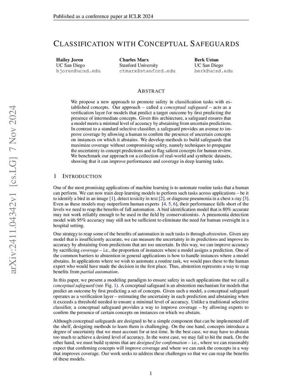 We propose a new approach to promote safety in classification tasks with established concepts. Our approach -- called a conceptual safeguard -- acts as a verification layer for models that predict a target outcome by first predicting the presence of intermediate concepts. Given this architecture, a safeguard ensures that a model meets a minimal level of accuracy by abstaining from uncertain predictions. In contrast to a standard selective classifier, a safeguard provides an avenue to improve coverage by allowing a human to confirm the presence of uncertain concepts on instances on which it abstains. We develop methods to build safeguards that maximize coverage without compromising safety, namely techniques to propagate the uncertainty in concept predictions and to flag salient concepts for human review. We benchmark our approach on a collection of real-world and synthetic datasets, showing that it can improve performance and coverage in deep learning tasks.
