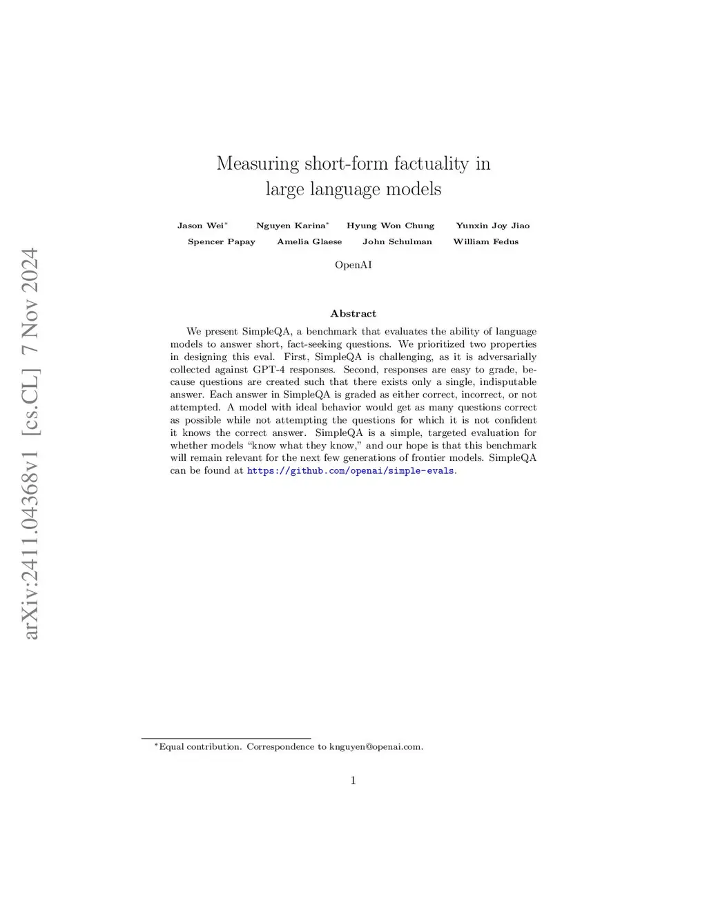 We present SimpleQA, a benchmark that evaluates the ability of language models to answer short, fact-seeking questions. We prioritized two properties in designing this eval. First, SimpleQA is challenging, as it is adversarially collected against GPT-4 responses. Second, responses are easy to grade, because questions are created such that there exists only a single, indisputable answer. Each answer in SimpleQA is graded as either correct, incorrect, or not attempted. A model with ideal behavior would get as many questions correct as possible while not attempting the questions for which it is not confident it knows the correct answer. SimpleQA is a simple, targeted evaluation for whether models "know what they know," and our hope is that this benchmark will remain relevant for the next few generations of frontier models. SimpleQA can be found at https://github.com/openai/simple-evals.