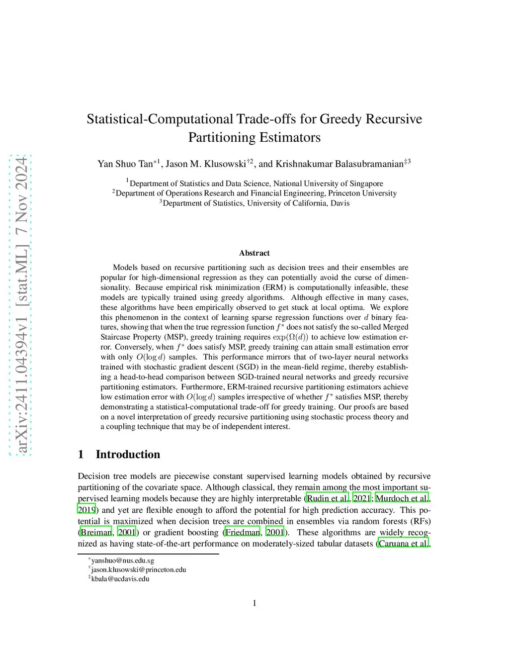 Models based on recursive adaptive partitioning such as decision trees and their ensembles are popular for high-dimensional regression as they can potentially avoid the curse of dimensionality. Because empirical risk minimization (ERM) is computationally infeasible, these models are typically trained using greedy algorithms. Although effective in many cases, these algorithms have been empirically observed to get stuck at local optima. We explore this phenomenon in the context of learning sparse regression functions over binary features, showing that when the true regression function does not satisfy Abbe et al. (2022)'s Merged Staircase Property (MSP), greedy training requires to achieve low estimation error. Conversely, when does satisfy MSP, greedy training can attain small estimation error with only samples. This dichotomy mirrors that of two-layer neural networks trained with stochastic gradient descent (SGD) in the mean-field regime, thereby establishing a head-to-head comparison between SGD-trained neural networks and greedy recursive partitioning estimators. Furthermore, ERM-trained recursive partitioning estimators achieve low estimation error with samples irrespective of whether satisfies MSP, thereby demonstrating a statistical-computational trade-off for greedy training. Our proofs are based on a novel interpretation of greedy recursive partitioning using stochastic process theory and a coupling technique that may be of independent interest.