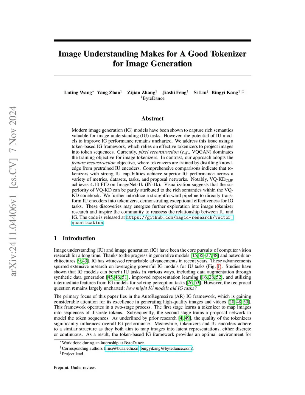 Abstract Modern image generation (IG) models have been shown to capture rich semantics valuable for image understanding (IU) tasks. However, the potential of IU models to improve IG performance remains uncharted. We address this issue using a token-based IG framework, which relies on effective tokenizers to project images into token sequences. Currently, pixel reconstruction (e.g., VQGAN) dominates the training objective for image tokenizers. In contrast, our approach adopts the feature reconstruction objective, where tokenizers are trained by distilling knowledge from pretrained IU encoders. Comprehensive comparisons indicate that tokenizers with strong IU capabilities achieve superior IG performance across a variety of metrics, datasets, tasks, and proposal networks. Notably, VQ-KD CLIP achieves FID on ImageNet-1k (IN-1k). Visualization suggests that the superiority of VQ-KD can be partly attributed to the rich semantics within the VQ-KD codebook. We further introduce a straightforward pipeline to directly transform IU encoders into tokenizers, demonstrating exceptional effectiveness for IG tasks. These discoveries may energize further exploration into image tokenizer research and inspire the community to reassess the relationship between IU and IG. The code is released at https://github.com/magic-research/vector_quantization.