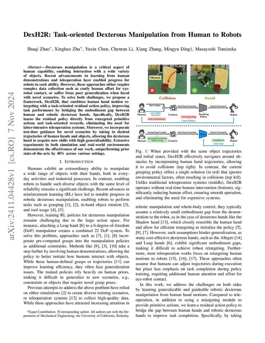 Dexterous manipulation is a critical aspect of human capability, enabling interaction with a wide variety of objects. Recent advancements in learning from human demonstrations and teleoperation have enabled progress for robots in such ability. However, these approaches either require complex data collection such as costly human effort for eye-robot contact, or suffer from poor generalization when faced with novel scenarios. To solve both challenges, we propose a framework, DexH2R, that combines human hand motion retargeting with a task-oriented residual action policy, improving task performance by bridging the embodiment gap between human and robotic dexterous hands. Specifically, DexH2R learns the residual policy directly from retargeted primitive actions and task-oriented rewards, eliminating the need for labor-intensive teleoperation systems. Moreover, we incorporate test-time guidance for novel scenarios by taking in desired trajectories of human hands and objects, allowing the dexterous hand to acquire new skills with high generalizability. Extensive experiments in both simulation and real-world environments demonstrate the effectiveness of our work, outperforming prior state-of-the-arts by 40% across various settings.