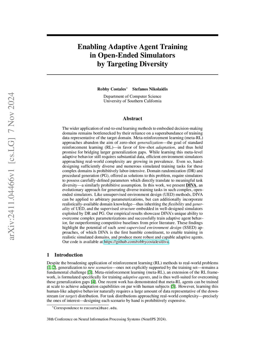 The wider application of end-to-end learning methods to embodied decision-making domains remains bottlenecked by their reliance on a superabundance of training data representative of the target domain. Meta-reinforcement learning (meta-RL) approaches abandon the aim of zero-shot generalization--the goal of standard reinforcement learning (RL)--in favor of few-shot adaptation, and thus hold promise for bridging larger generalization gaps. While learning this meta-level adaptive behavior still requires substantial data, efficient environment simulators approaching real-world complexity are growing in prevalence. Even so, hand-designing sufficiently diverse and numerous simulated training tasks for these complex domains is prohibitively labor-intensive. Domain randomization (DR) and procedural generation (PG), offered as solutions to this problem, require simulators to possess carefully-defined parameters which directly translate to meaningful task diversity--a similarly prohibitive assumption. In this work, we present DIVA, an evolutionary approach for generating diverse training tasks in such complex, open-ended simulators. Like unsupervised environment design (UED) methods, DIVA can be applied to arbitrary parameterizations, but can additionally incorporate realistically-available domain knowledge--thus inheriting the flexibility and generality of UED, and the supervised structure embedded in well-designed simulators exploited by DR and PG. Our empirical results showcase DIVA's unique ability to overcome complex parameterizations and successfully train adaptive agent behavior, far outperforming competitive baselines from prior literature. These findings highlight the potential of such semi-supervised environment design (SSED) approaches, of which DIVA is the first humble constituent, to enable training in realistic simulated domains, and produce more robust and capable adaptive agents.