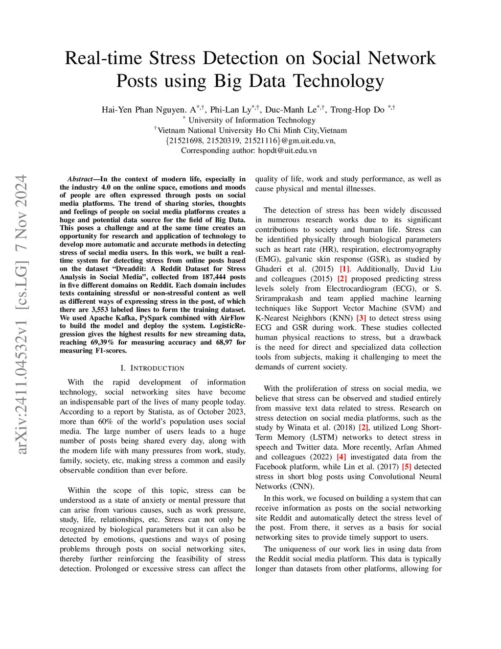 In the context of modern life, particularly in Industry 4.0 within the online space, emotions and moods are frequently conveyed through social media posts. The trend of sharing stories, thoughts, and feelings on these platforms generates a vast and promising data source for Big Data. This creates both a challenge and an opportunity for research in applying technology to develop more automated and accurate methods for detecting stress in social media users. In this study, we developed a real-time system for stress detection in online posts, using the "Dreaddit: A Reddit Dataset for Stress Analysis in Social Media," which comprises 187,444 posts across five different Reddit domains. Each domain contains texts with both stressful and non-stressful content, showcasing various expressions of stress. A labeled dataset of 3,553 lines was created for training. Apache Kafka, PySpark, and AirFlow were utilized to build and deploy the model. Logistic Regression yielded the best results for new streaming data, achieving 69,39% for measuring accuracy and 68,97 for measuring F1-scores.