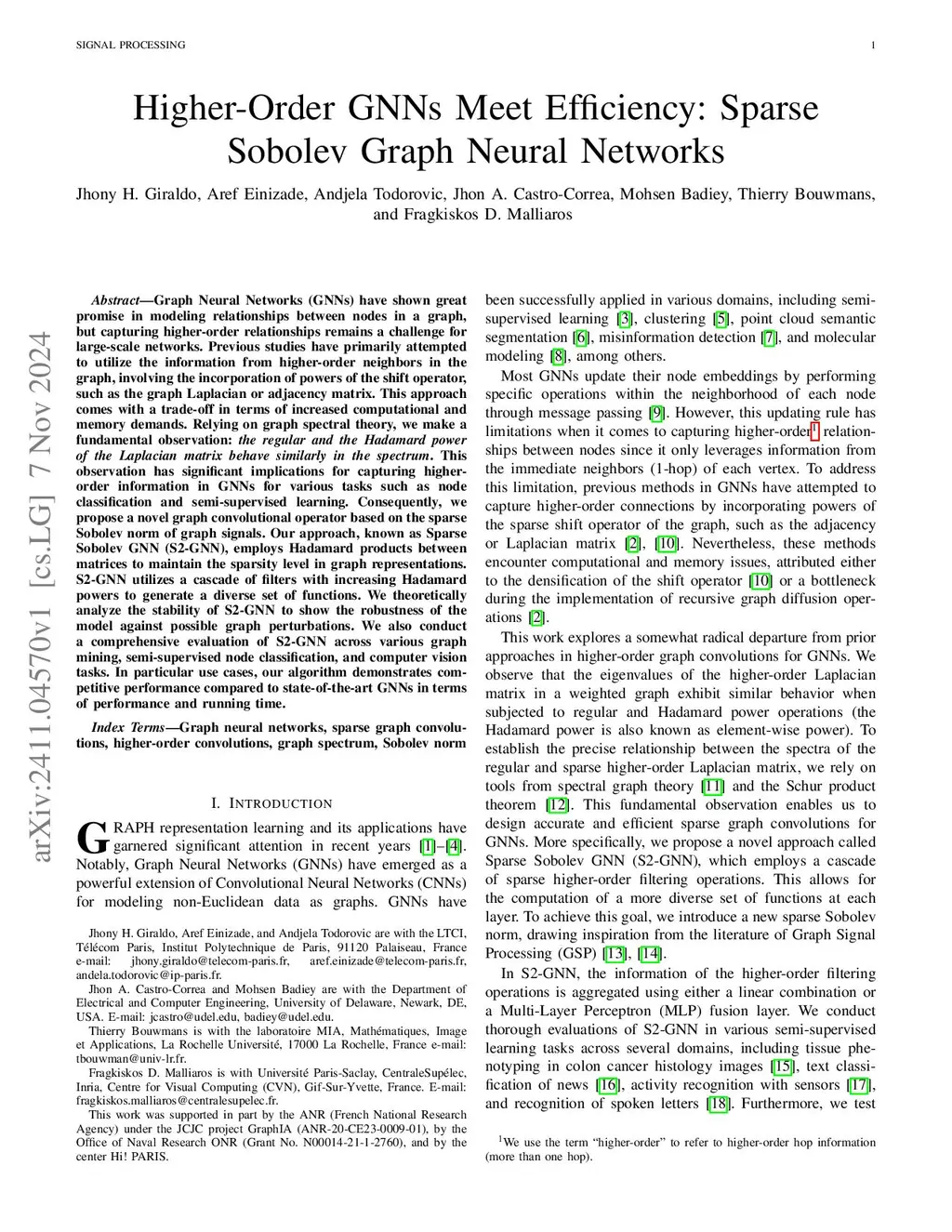 Graph Neural Networks (GNNs) have shown great promise in modeling relationships between nodes in a graph, but capturing higher-order relationships remains a challenge for large-scale networks. Previous studies have primarily attempted to utilize the information from higher-order neighbors in the graph, involving the incorporation of powers of the shift operator, such as the graph Laplacian or adjacency matrix. This approach comes with a trade-off in terms of increased computational and memory demands. Relying on graph spectral theory, we make a fundamental observation: the regular and the Hadamard power of the Laplacian matrix behave similarly in the spectrum. This observation has significant implications for capturing higher-order information in GNNs for various tasks such as node classification and semi-supervised learning. Consequently, we propose a novel graph convolutional operator based on the sparse Sobolev norm of graph signals. Our approach, known as Sparse Sobolev GNN (S2-GNN), employs Hadamard products between matrices to maintain the sparsity level in graph representations. S2-GNN utilizes a cascade of filters with increasing Hadamard powers to generate a diverse set of functions. We theoretically analyze the stability of S2-GNN to show the robustness of the model against possible graph perturbations. We also conduct a comprehensive evaluation of S2-GNN across various graph mining, semi-supervised node classification, and computer vision tasks. In particular use cases, our algorithm demonstrates competitive performance compared to state-of-the-art GNNs in terms of performance and running time.