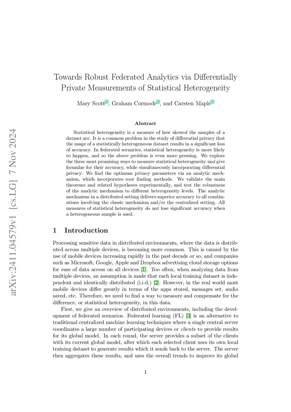 Statistical heterogeneity is a measure of how skewed the samples of a dataset are. It is a common problem in the study of differential privacy that the usage of a statistically heterogeneous dataset results in a significant loss of accuracy. In federated scenarios, statistical heterogeneity is more likely to happen, and so the above problem is even more pressing. We explore the three most promising ways to measure statistical heterogeneity and give formulae for their accuracy, while simultaneously incorporating differential privacy. We find the optimum privacy parameters via an analytic mechanism, which incorporates root finding methods. We validate the main theorems and related hypotheses experimentally, and test the robustness of the analytic mechanism to different heterogeneity levels. The analytic mechanism in a distributed setting delivers superior accuracy to all combinations involving the classic mechanism and/or the centralized setting. All measures of statistical heterogeneity do not lose significant accuracy when a heterogeneous sample is used.