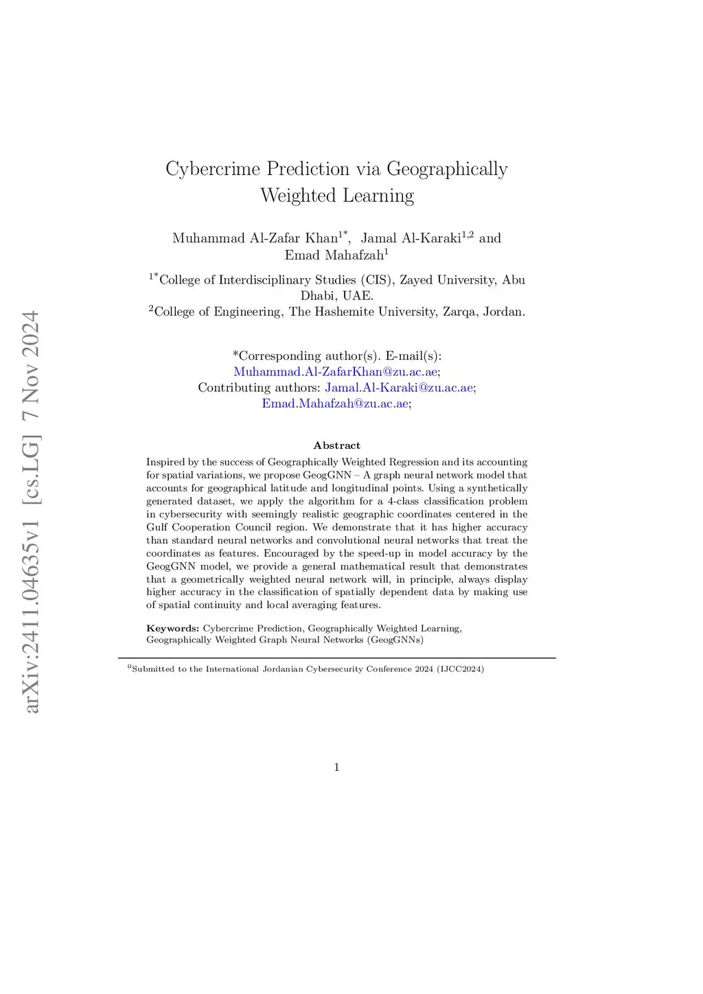 Inspired by the success of Geographically Weighted Regression and its accounting for spatial variations, we propose GeogGNN -- A graph neural network model that accounts for geographical latitude and longitudinal points. Using a synthetically generated dataset, we apply the algorithm for a 4-class classification problem in cybersecurity with seemingly realistic geographic coordinates centered in the Gulf Cooperation Council region. We demonstrate that it has higher accuracy than standard neural networks and convolutional neural networks that treat the coordinates as features. Encouraged by the speed-up in model accuracy by the GeogGNN model, we provide a general mathematical result that demonstrates that a geometrically weighted neural network will, in principle, always display higher accuracy in the classification of spatially dependent data by making use of spatial continuity and local averaging features.