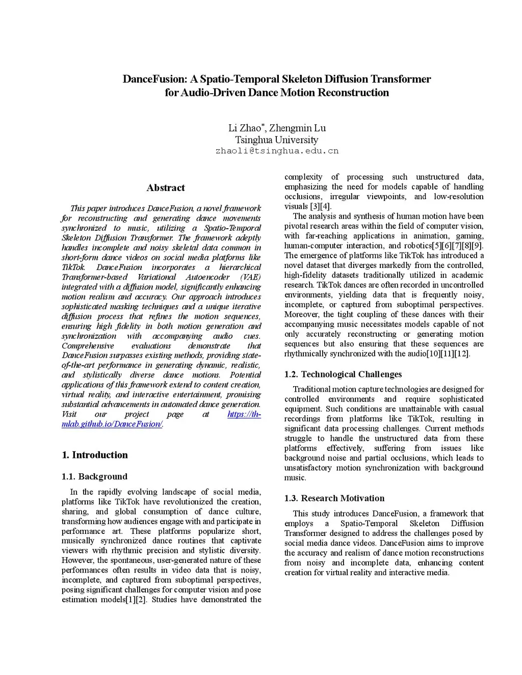 This paper introduces DanceFusion, a novel framework for reconstructing and generating dance movements synchronized to music, utilizing a Spatio-Temporal Skeleton Diffusion Transformer. The framework adeptly handles incomplete and noisy skeletal data common in short-form dance videos on social media platforms like TikTok. DanceFusion incorporates a hierarchical Transformer-based Variational Autoencoder (VAE) integrated with a diffusion model, significantly enhancing motion realism and accuracy. Our approach introduces sophisticated masking techniques and a unique iterative diffusion process that refines the motion sequences, ensuring high fidelity in both motion generation and synchronization with accompanying audio cues. Comprehensive evaluations demonstrate that DanceFusion surpasses existing methods, providing state-of-the-art performance in generating dynamic, realistic, and stylistically diverse dance motions. Potential applications of this framework extend to content creation, virtual reality, and interactive entertainment, promising substantial advancements in automated dance generation. Visit our project page at https://th-mlab.github.io/DanceFusion/.