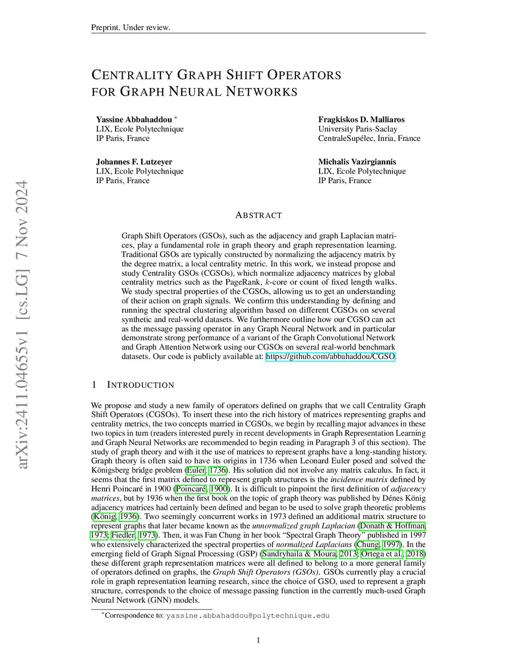 Graph Shift Operators (GSOs), such as the adjacency and graph Laplacian matrices, play a fundamental role in graph theory and graph representation learning. Traditional GSOs are typically constructed by normalizing the adjacency matrix by the degree matrix, a local centrality metric. In this work, we instead propose and study Centrality GSOs (CGSOs), which normalize adjacency matrices by global centrality metrics such as the PageRank, -core or count of fixed length walks. We study spectral properties of the CGSOs, allowing us to get an understanding of their action on graph signals. We confirm this understanding by defining and running the spectral clustering algorithm based on different CGSOs on several synthetic and real-world datasets. We furthermore outline how our CGSO can act as the message passing operator in any Graph Neural Network and in particular demonstrate strong performance of a variant of the Graph Convolutional Network and Graph Attention Network using our CGSOs on several real-world benchmark datasets.
