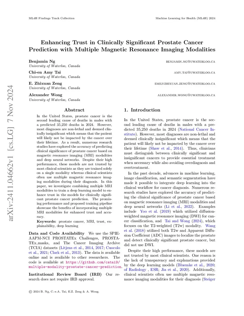 In the United States, prostate cancer is the second leading cause of deaths in males with a predicted 35,250 deaths in 2024. However, most diagnoses are non-lethal and deemed clinically insignificant which means that the patient will likely not be impacted by the cancer over their lifetime. As a result, numerous research studies have explored the accuracy of predicting clinical significance of prostate cancer based on magnetic resonance imaging (MRI) modalities and deep neural networks. Despite their high performance, these models are not trusted by most clinical scientists as they are trained solely on a single modality whereas clinical scientists often use multiple magnetic resonance imaging modalities during their diagnosis. In this paper, we investigate combining multiple MRI modalities to train a deep learning model to enhance trust in the models for clinically significant prostate cancer prediction. The promising performance and proposed training pipeline showcase the benefits of incorporating multiple MRI modalities for enhanced trust and accuracy.