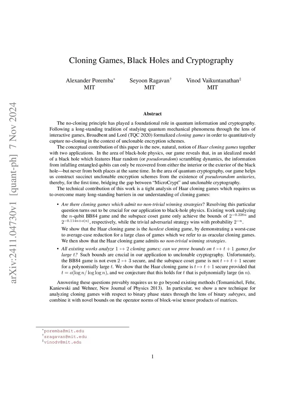 Cloning Games, Black Holes and Cryptography