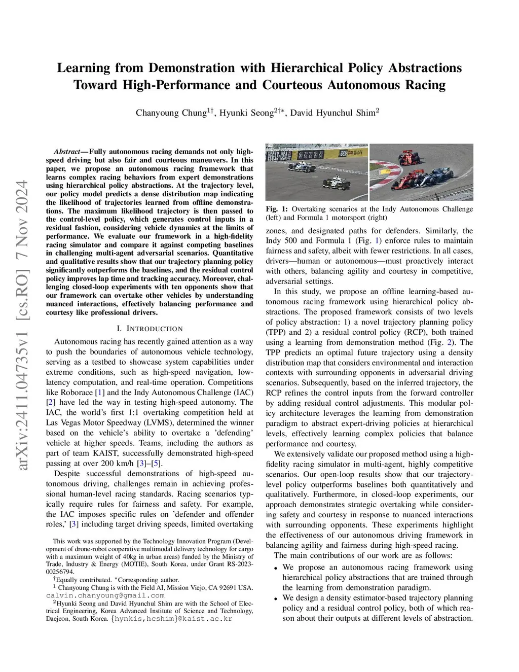 Fully autonomous racing demands not only high-speed driving but also fair and courteous maneuvers. In this paper, we propose an autonomous racing framework that learns complex racing behaviors from expert demonstrations using hierarchical policy abstractions. At the trajectory level, our policy model predicts a dense distribution map indicating the likelihood of trajectories learned from offline demonstrations. The maximum likelihood trajectory is then passed to the control-level policy, which generates control inputs in a residual fashion, considering vehicle dynamics at the limits of performance. We evaluate our framework in a high-fidelity racing simulator and compare it against competing baselines in challenging multi-agent adversarial scenarios. Quantitative and qualitative results show that our trajectory planning policy significantly outperforms the baselines, and the residual control policy improves lap time and tracking accuracy. Moreover, challenging closed-loop experiments with ten opponents show that our framework can overtake other vehicles by understanding nuanced interactions, effectively balancing performance and courtesy like professional drivers.