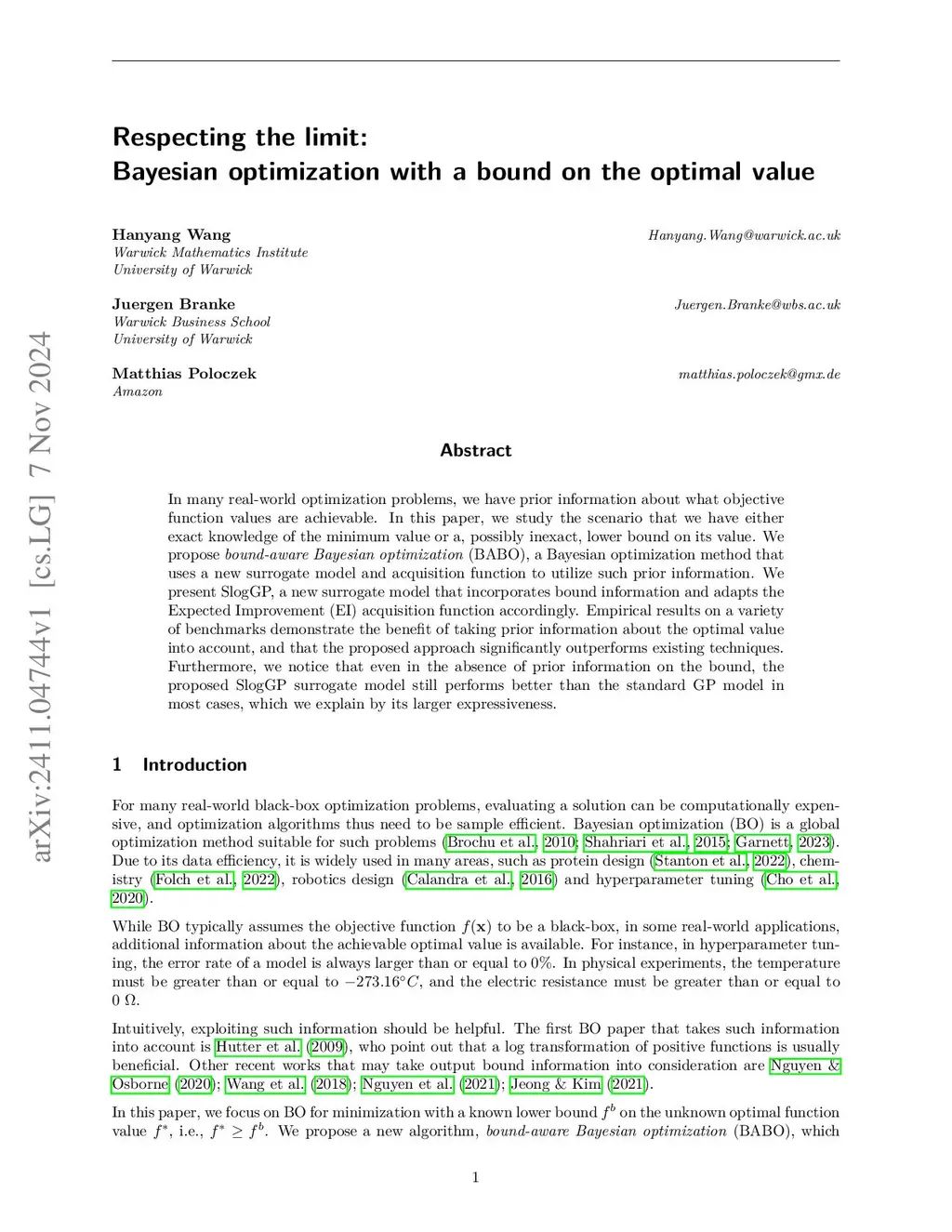 Respecting the limit:Bayesian optimization with a bound on the optimal value