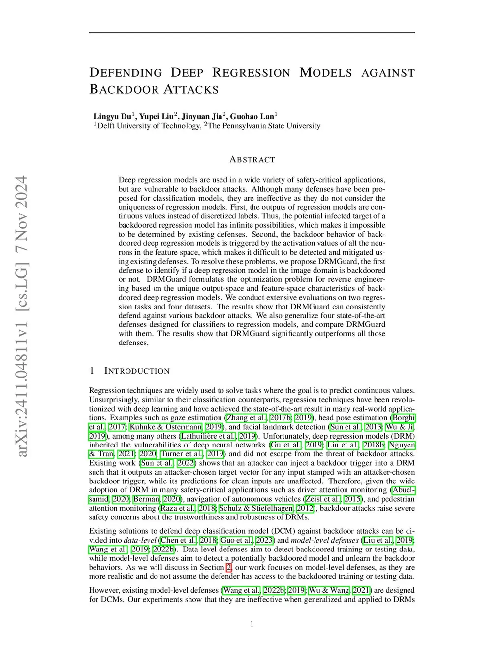 Deep regression models are used in a wide variety of safety-critical applications, but are vulnerable to backdoor attacks. Although many defenses have been proposed for classification models, they are ineffective as they do not consider the uniqueness of regression models. First, the outputs of regression models are continuous values instead of discretized labels. Thus, the potential infected target of a backdoored regression model has infinite possibilities, which makes it impossible to be determined by existing defenses. Second, the backdoor behavior of backdoored deep regression models is triggered by the activation values of all the neurons in the feature space, which makes it difficult to be detected and mitigated using existing defenses. To resolve these problems, we propose DRMGuard, the first defense to identify if a deep regression model in the image domain is backdoored or not. DRMGuard formulates the optimization problem for reverse engineering based on the unique output-space and feature-space characteristics of backdoored deep regression models. We conduct extensive evaluations on two regression tasks and four datasets. The results show that DRMGuard can consistently defend against various backdoor attacks. We also generalize four state-of-the-art defenses designed for classifiers to regression models, and compare DRMGuard with them. The results show that DRMGuard significantly outperforms all those defenses.