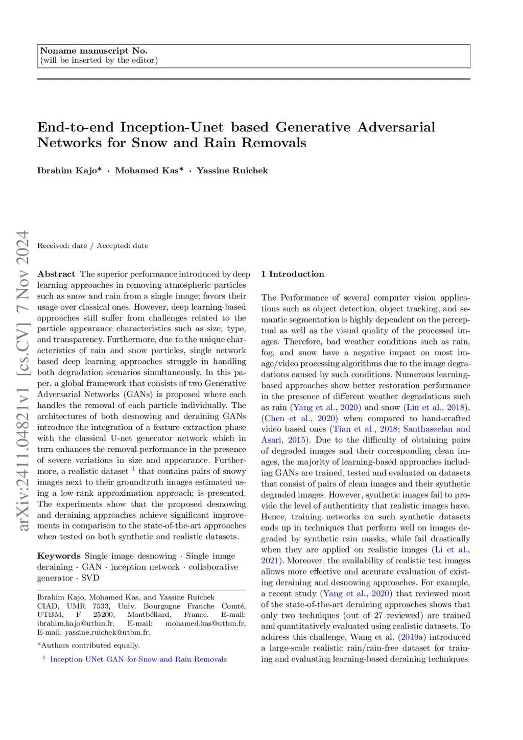 End-to-end Inception-Unet based Generative Adversarial Networks for Snow