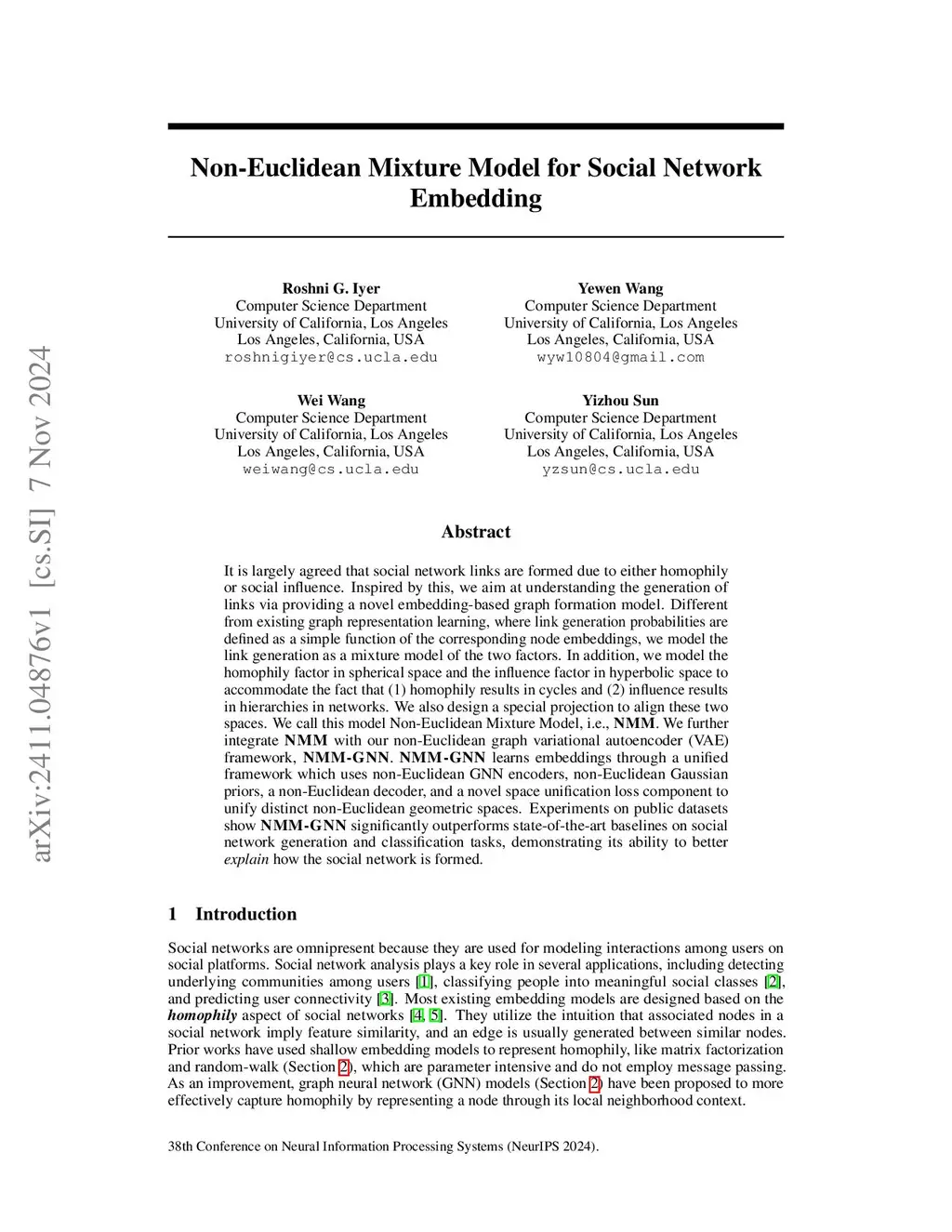 It is largely agreed that social network links are formed due to either homophily or social influence. Inspired by this, we aim at understanding the generation of links via providing a novel embedding-based graph formation model. Different from existing graph representation learning, where link generation probabilities are defined as a simple function of the corresponding node embeddings, we model the link generation as a mixture model of the two factors. In addition, we model the homophily factor in spherical space and the influence factor in hyperbolic space to accommodate the fact that (1) homophily results in cycles and (2) influence results in hierarchies in networks. We also design a special projection to align these two spaces. We call this model Non-Euclidean Mixture Model, i.e., NMM. We further integrate NMM with our non-Euclidean graph variational autoencoder (VAE) framework, NMM-GNN. NMM-GNN learns embeddings through a unified framework which uses non-Euclidean GNN encoders, non-Euclidean Gaussian priors, a non-Euclidean decoder, and a novel space unification loss component to unify distinct non-Euclidean geometric spaces. Experiments on public datasets show NMM-GNN significantly outperforms state-of-the-art baselines on social network generation and classification tasks, demonstrating its ability to better explain how the social network is formed.
