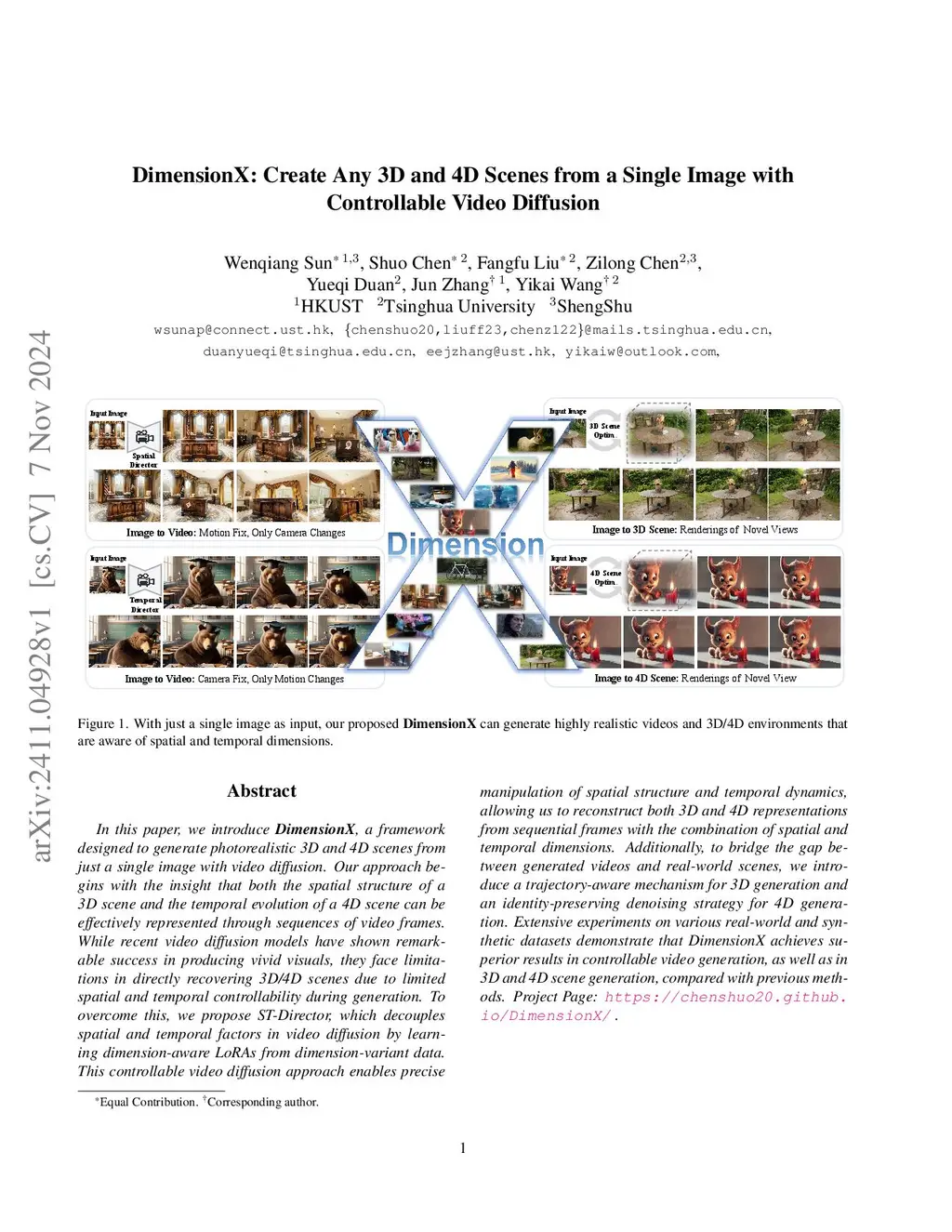 In this paper, we introduce \textbf{DimensionX}, a framework designed to generate photorealistic 3D and 4D scenes from just a single image with video diffusion. Our approach begins with the insight that both the spatial structure of a 3D scene and the temporal evolution of a 4D scene can be effectively represented through sequences of video frames. While recent video diffusion models have shown remarkable success in producing vivid visuals, they face limitations in directly recovering 3D/4D scenes due to limited spatial and temporal controllability during generation. To overcome this, we propose ST-Director, which decouples spatial and temporal factors in video diffusion by learning dimension-aware LoRAs from dimension-variant data. This controllable video diffusion approach enables precise manipulation of spatial structure and temporal dynamics, allowing us to reconstruct both 3D and 4D representations from sequential frames with the combination of spatial and temporal dimensions. Additionally, to bridge the gap between generated videos and real-world scenes, we introduce a trajectory-aware mechanism for 3D generation and an identity-preserving denoising strategy for 4D generation. Extensive experiments on various real-world and synthetic datasets demonstrate that DimensionX achieves superior results in controllable video generation, as well as in 3D and 4D scene generation, compared with previous methods.