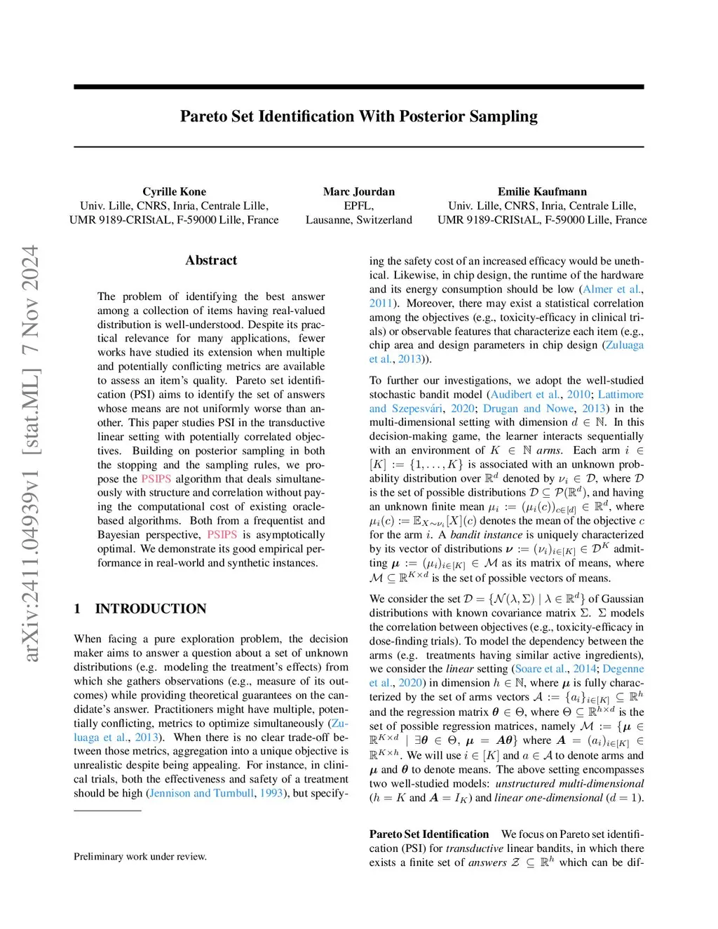 The problem of identifying the best answer among a collection of items having real-valued distribution is well-understood. Despite its practical relevance for many applications, fewer works have studied its extension when multiple and potentially conflicting metrics are available to assess an item's quality. Pareto set identification (PSI) aims to identify the set of answers whose means are not uniformly worse than another. This paper studies PSI in the transductive linear setting with potentially correlated objectives. Building on posterior sampling in both the stopping and the sampling rules, we propose the PSIPS algorithm that deals simultaneously with structure and correlation without paying the computational cost of existing oracle-based algorithms. Both from a frequentist and Bayesian perspective, PSIPS is asymptotically optimal. We demonstrate its good empirical performance in real-world and synthetic instances.