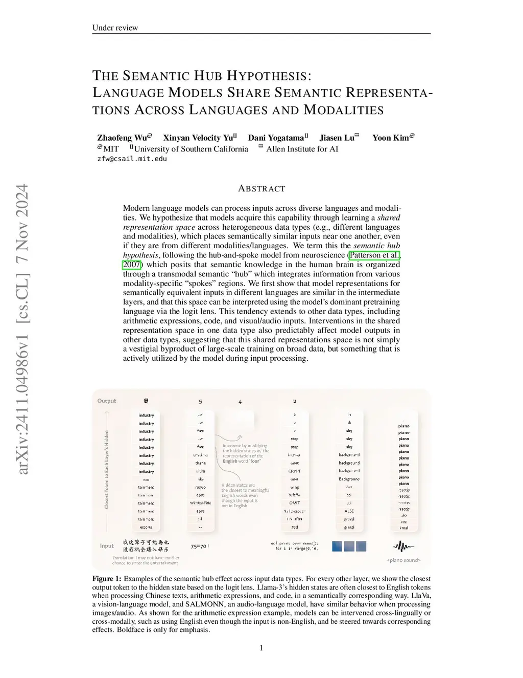 Modern language models can process inputs across diverse languages and modalities. We hypothesize that models acquire this capability through learning a shared representation space across heterogeneous data types (e.g., different languages and modalities), which places semantically similar inputs near one another, even if they are from different modalities/languages. We term this the semantic hub hypothesis, following the hub-and-spoke model from neuroscience (Patterson et al., 2007) which posits that semantic knowledge in the human brain is organized through a transmodal semantic "hub" which integrates information from various modality-specific "spokes" regions. We first show that model representations for semantically equivalent inputs in different languages are similar in the intermediate layers, and that this space can be interpreted using the model's dominant pretraining language via the logit lens. This tendency extends to other data types, including arithmetic expressions, code, and visual/audio inputs. Interventions in the shared representation space in one data type also predictably affect model outputs in other data types, suggesting that this shared representations space is not simply a vestigial byproduct of large-scale training on broad data, but something that is actively utilized by the model during input processing.