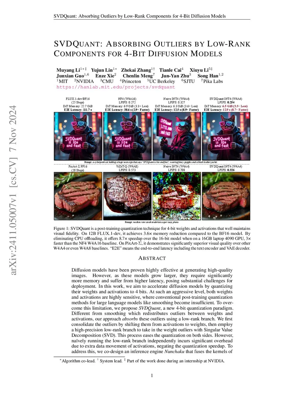 SVDQuant: Absorbing Outliers by Low-Rank Components for 4-Bit Diffusion Models