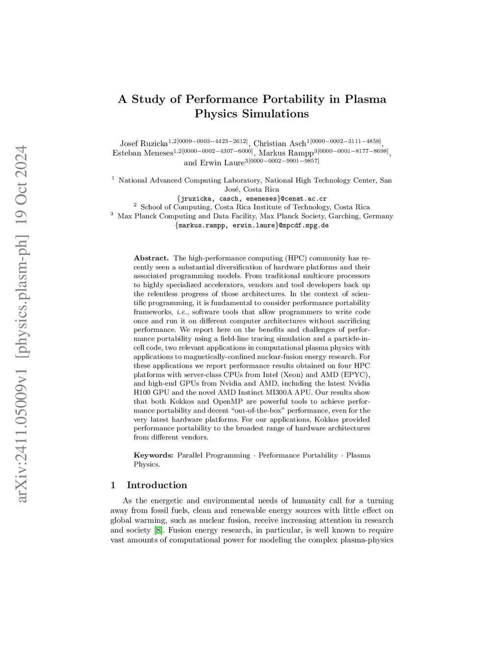 A Study of Performance Portability in Plasma Physics Simulations