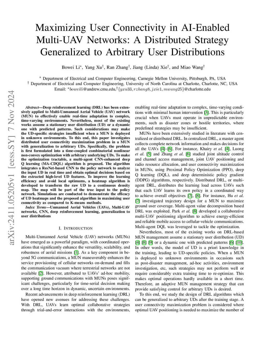 Deep reinforcement learning (DRL) has been extensively applied to Multi-Unmanned Aerial Vehicle (UAV) network (MUN) to effectively enable real-time adaptation to complex, time-varying environments. Nevertheless, most of the existing works assume a stationary user distribution (UD) or a dynamic one with predicted patterns. Such considerations may make the UD-specific strategies insufficient when a MUN is deployed in unknown environments. To this end, this paper investigates distributed user connectivity maximization problem in a MUN with generalization to arbitrary UDs. Specifically, the problem is first formulated into a time-coupled combinatorial nonlinear non-convex optimization with arbitrary underlying UDs. To make the optimization tractable, a multi-agent CNN-enhanced deep Q learning (MA-CDQL) algorithm is proposed. The algorithm integrates a ResNet-based CNN to the policy network to analyze the input UD in real time and obtain optimal decisions based on the extracted high-level UD features. To improve the learning efficiency and avoid local optimums, a heatmap algorithm is developed to transform the raw UD to a continuous density map. The map will be part of the true input to the policy network. Simulations are conducted to demonstrate the efficacy of UD heatmaps and the proposed algorithm in maximizing user connectivity as compared to K-means methods.