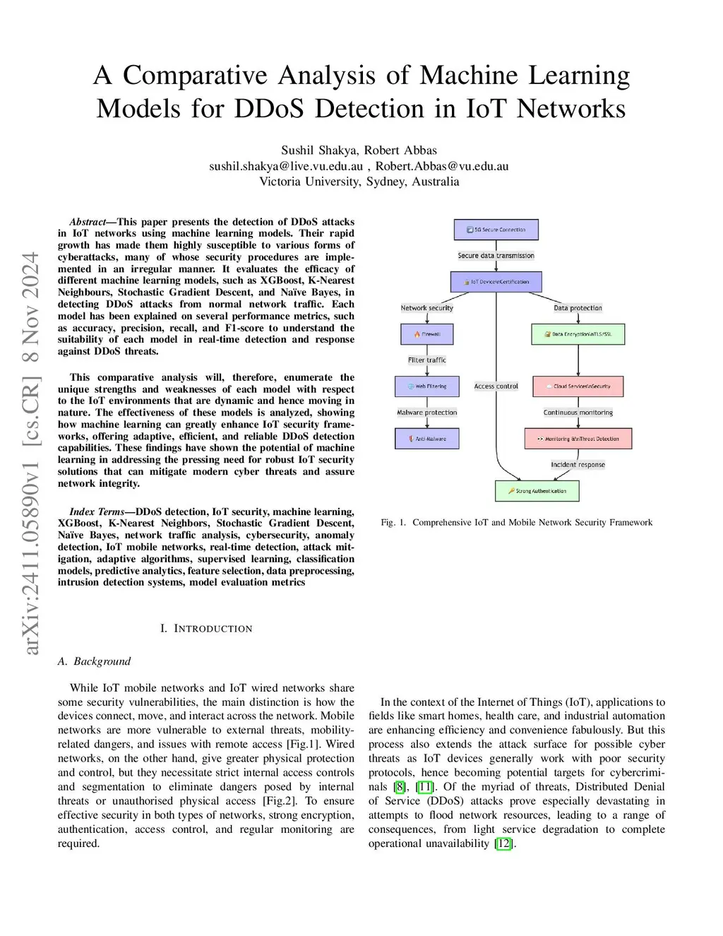 This paper presents the detection of DDoS attacks in IoT networks using machine learning models. Their rapid growth has made them highly susceptible to various forms of cyberattacks, many of whose security procedures are implemented in an irregular manner. It evaluates the efficacy of different machine learning models, such as XGBoost, K-Nearest Neighbours, Stochastic Gradient Descent, and Na\"ive Bayes, in detecting DDoS attacks from normal network traffic. Each model has been explained on several performance metrics, such as accuracy, precision, recall, and F1-score to understand the suitability of each model in real-time detection and response against DDoS threats. This comparative analysis will, therefore, enumerate the unique strengths and weaknesses of each model with respect to the IoT environments that are dynamic and hence moving in nature. The effectiveness of these models is analyzed, showing how machine learning can greatly enhance IoT security frameworks, offering adaptive, efficient, and reliable DDoS detection capabilities. These findings have shown the potential of machine learning in addressing the pressing need for robust IoT security solutions that can mitigate modern cyber threats and assure network integrity.