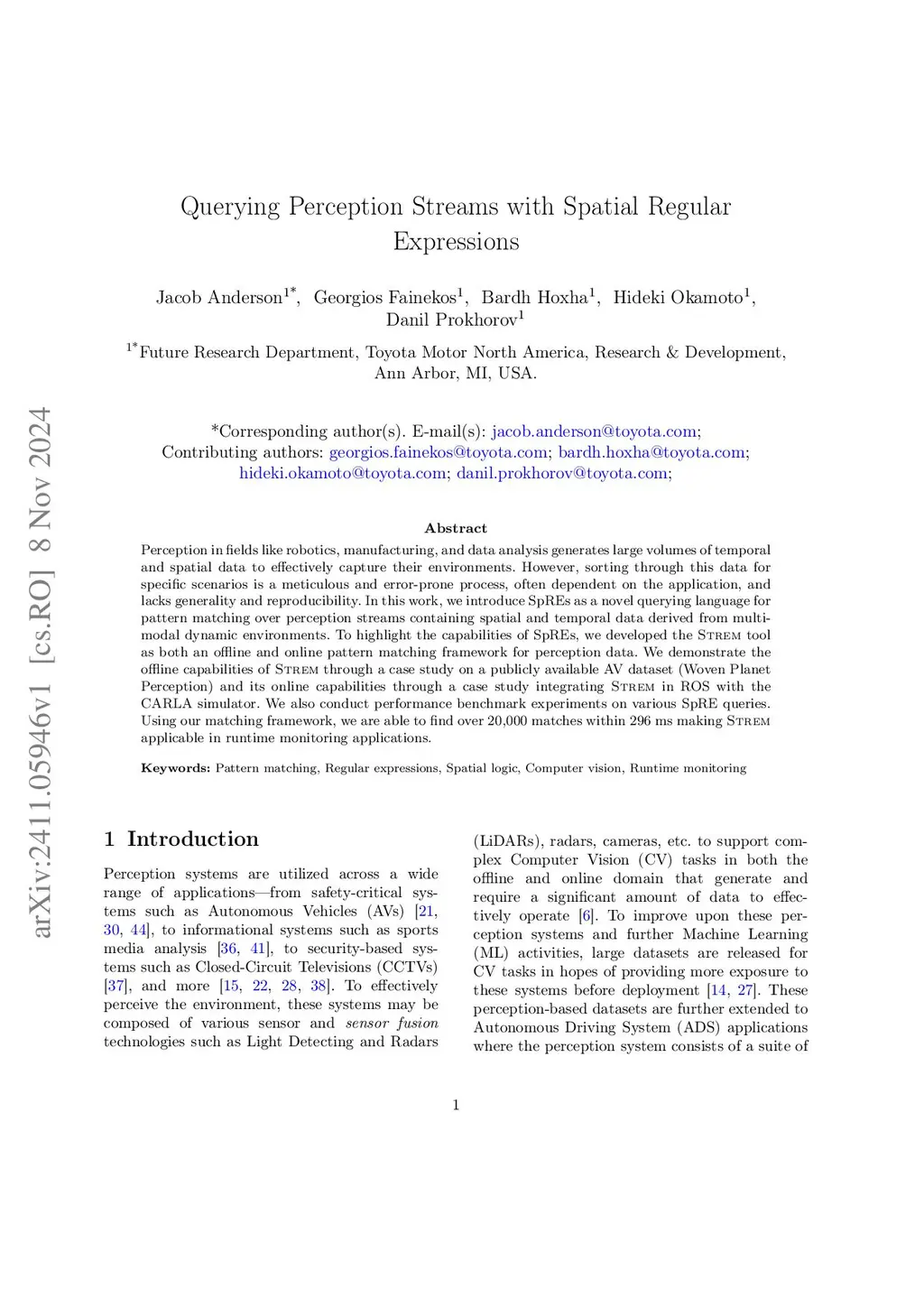 Perception in fields like robotics, manufacturing, and data analysis generates large volumes of temporal and spatial data to effectively capture their environments. However, sorting through this data for specific scenarios is a meticulous and error-prone process, often dependent on the application, and lacks generality and reproducibility. In this work, we introduce SpREs as a novel querying language for pattern matching over perception streams containing spatial and temporal data derived from multi-modal dynamic environments. To highlight the capabilities of SpREs, we developed the STREM tool as both an offline and online pattern matching framework for perception data. We demonstrate the offline capabilities of STREM through a case study on a publicly available AV dataset (Woven Planet Perception) and its online capabilities through a case study integrating STREM in ROS with the CARLA simulator. We also conduct performance benchmark experiments on various SpRE queries. Using our matching framework, we are able to find over 20,000 matches within 296 ms making STREM applicable in runtime monitoring applications.
