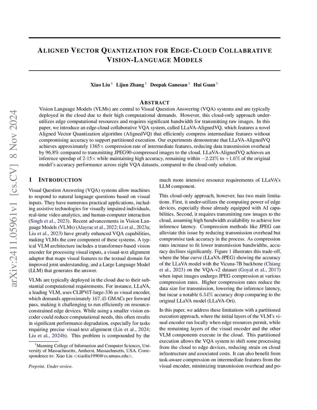 Vision Language Models (VLMs) are central to Visual Question Answering (VQA) systems and are typically deployed in the cloud due to their high computational demands. However, this cloud-only approach underutilizes edge computational resources and requires significant bandwidth for transmitting raw images. In this paper, we introduce an edge-cloud collaborative VQA system, called LLaVA-AlignedVQ, which features a novel Aligned Vector Quantization algorithm (AlignedVQ) that efficiently compress intermediate features without compromising accuracy to support partitioned execution. Our experiments demonstrate that LLaVA-AlignedVQ achieves approximately 1365x compression rate of intermediate features, reducing data transmission overhead by 96.8% compared to transmitting JPEG90-compressed images to the cloud. LLaVA-AlignedVQ achieves an inference speedup of 2-15x while maintaining high accuracy, remaining within -2.23% to +1.6% of the original model's accuracy performance across eight VQA datasets, compared to the cloud-only solution.