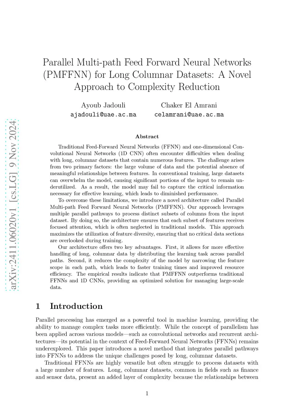 Traditional Feed-Forward Neural Networks (FFNN) and one-dimensional Convolutional Neural Networks (1D CNN) often encounter difficulties when dealing with long, columnar datasets that contain numerous features. The challenge arises from two primary factors: the large volume of data and the potential absence of meaningful relationships between features. In conventional training, large datasets can overwhelm the model, causing significant portions of the input to remain underutilized. As a result, the model may fail to capture the critical information necessary for effective learning, which leads to diminished performance. To overcome these limitations, we introduce a novel architecture called Parallel Multi-path Feed Forward Neural Networks (PMFFNN). Our approach leverages multiple parallel pathways to process distinct subsets of columns from the input dataset. By doing so, the architecture ensures that each subset of features receives focused attention, which is often neglected in traditional models. This approach maximizes the utilization of feature diversity, ensuring that no critical data sections are overlooked during training. Our architecture offers two key advantages. First, it allows for more effective handling of long, columnar data by distributing the learning task across parallel paths. Second, it reduces the complexity of the model by narrowing the feature scope in each path, which leads to faster training times and improved resource efficiency. The empirical results indicate that PMFFNN outperforms traditional FFNNs and 1D CNNs, providing an optimized solution for managing large-scale data.