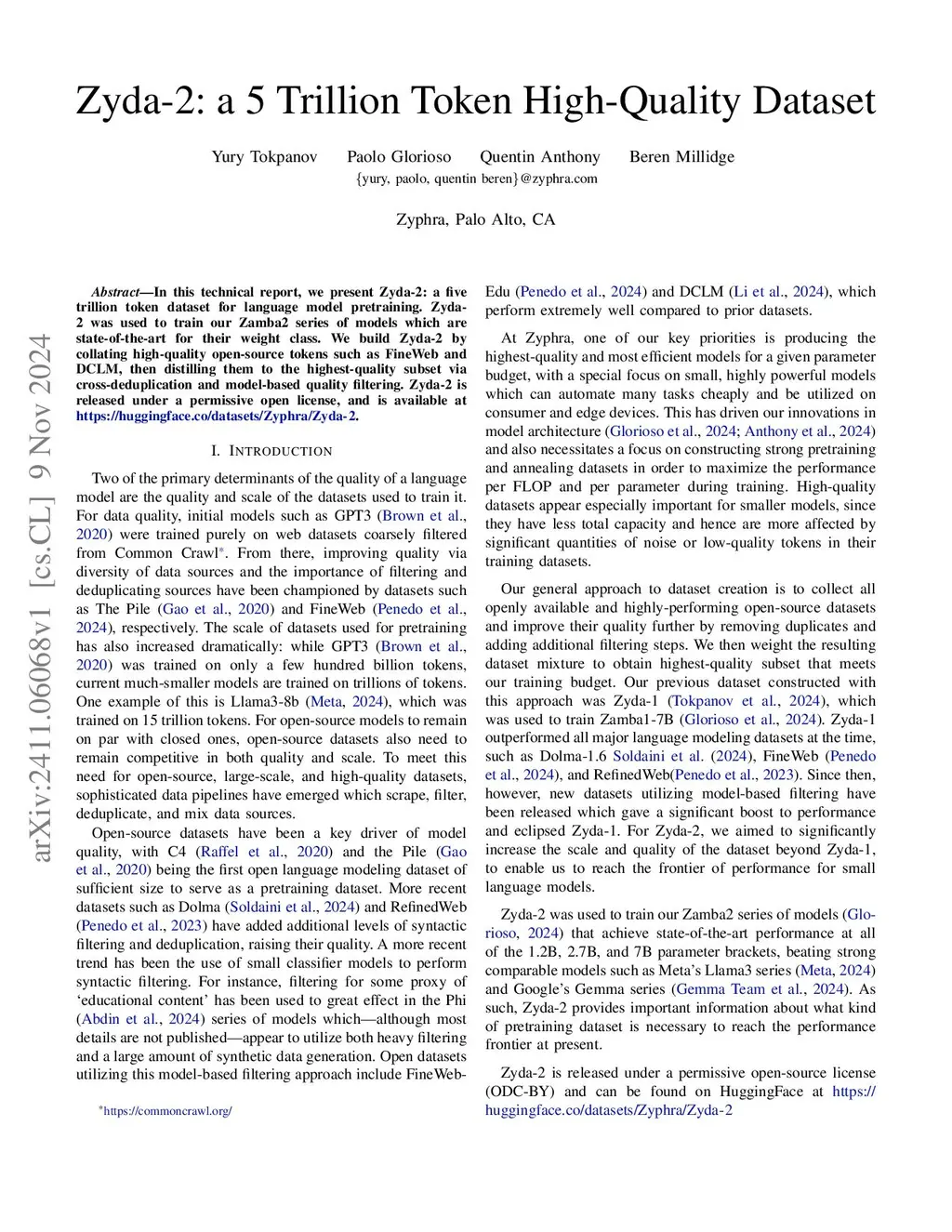 In this technical report, we present Zyda-2: a five trillion token dataset for language model pretraining. Zyda-2 was used to train our Zamba2 series of models which are state-of-the-art for their weight class. We build Zyda-2 by collating high-quality open-source tokens such as FineWeb and DCLM, then distilling them to the highest-quality subset via cross-deduplication and model-based quality filtering. Zyda-2 is released under a permissive open license, and is available at https://huggingface.co/datasets/Zyphra/Zyda-2