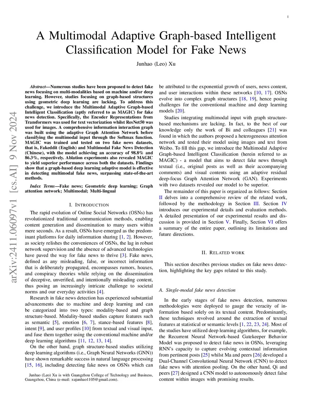 Numerous studies have been proposed to detect fake news focusing on multi-modalities based on machine and/or deep learning. However, studies focusing on graph-based structures using geometric deep learning are lacking. To address this challenge, we introduce the Multimodal Adaptive Graph-based Intelligent Classification (aptly referred to as MAGIC) for fake news detection. Specifically, the Encoder Representations from Transformers was used for text vectorization whilst ResNet50 was used for images. A comprehensive information interaction graph was built using the adaptive Graph Attention Network before classifying the multimodal input through the Softmax function. MAGIC was trained and tested on two fake news datasets, that is, Fakeddit (English) and Multimodal Fake News Detection (Chinese), with the model achieving an accuracy of 98.8\% and 86.3\%, respectively. Ablation experiments also revealed MAGIC to yield superior performance across both the datasets. Findings show that a graph-based deep learning adaptive model is effective in detecting multimodal fake news, surpassing state-of-the-art methods.