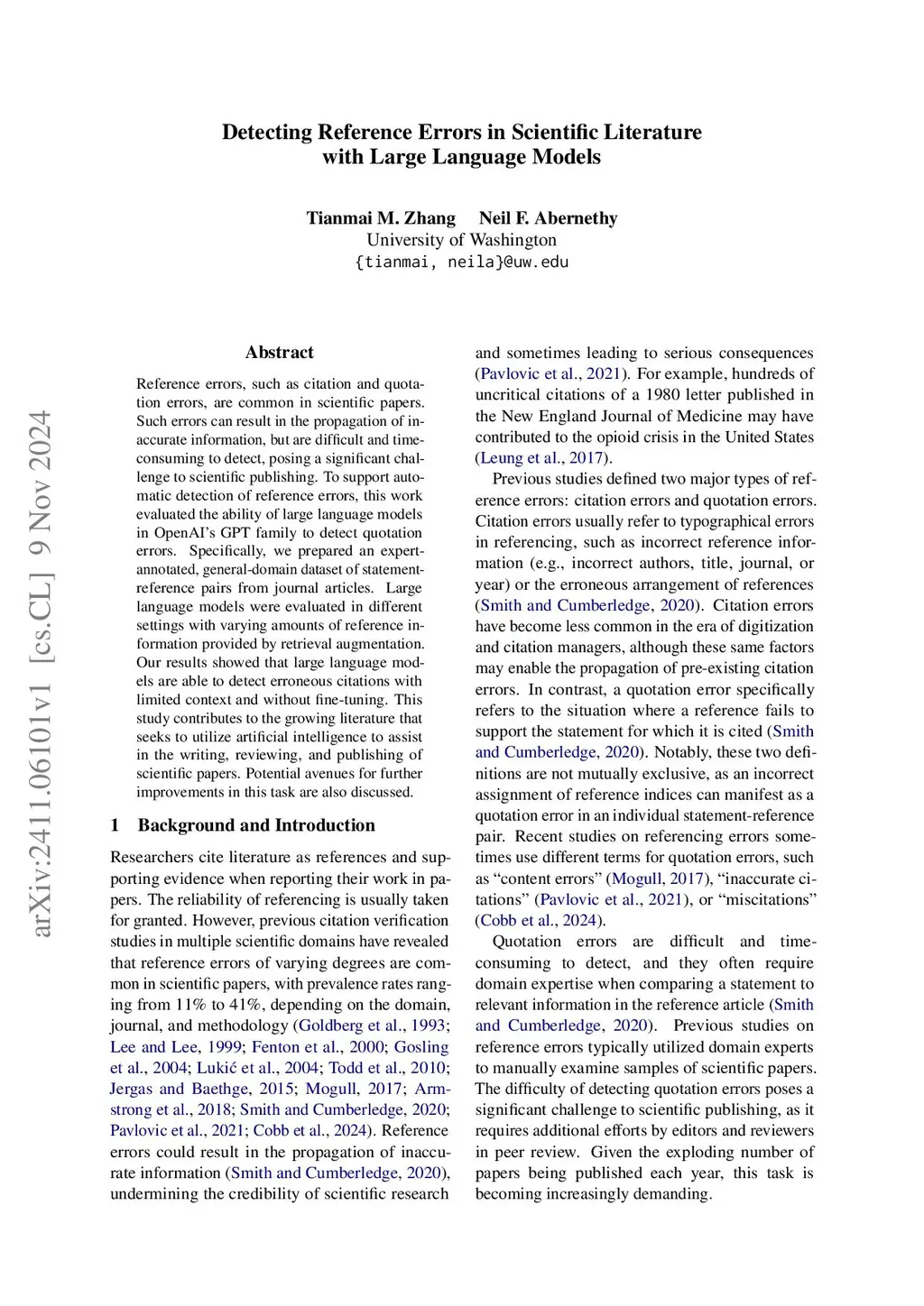 Reference errors, such as citation and quotation errors, are common in scientific papers. Such errors can result in the propagation of inaccurate information, but are difficult and time-consuming to detect, posing a significant challenge to scientific publishing. To support automatic detection of reference errors, this work evaluated the ability of large language models in OpenAI's GPT family to detect quotation errors. Specifically, we prepared an expert-annotated, general-domain dataset of statement-reference pairs from journal articles. Large language models were evaluated in different settings with varying amounts of reference information provided by retrieval augmentation. Our results showed that large language models are able to detect erroneous citations with limited context and without fine-tuning. This study contributes to the growing literature that seeks to utilize artificial intelligence to assist in the writing, reviewing, and publishing of scientific papers. Potential avenues for further improvements in this task are also discussed.