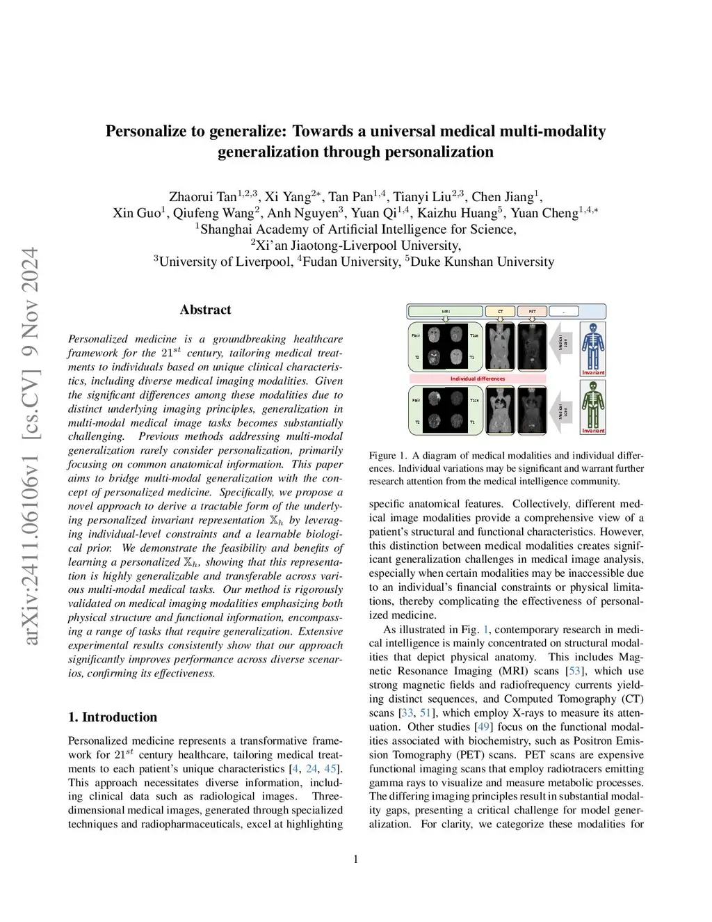 Variations in medical imaging modalities and individual anatomical differences pose challenges to cross-modality generalization in multi-modal tasks. Existing methods often concentrate exclusively on common anatomical patterns, thereby neglecting individual differences and consequently limiting their generalization performance. This paper emphasizes the critical role of learning individual-level invariance, i.e., personalized representation , to enhance multi-modality generalization under both homogeneous and heterogeneous settings. It reveals that mappings from individual biological profile to different medical modalities remain static across the population, which is implied in the personalization process. We propose a two-stage approach: pre-training with invariant representation for personalization, then fine-tuning for diverse downstream tasks. We provide both theoretical and empirical evidence demonstrating the feasibility and advantages of personalization, showing that our approach yields greater generalizability and transferability across diverse multi-modal medical tasks compared to methods lacking personalization. Extensive experiments further validate that our approach significantly enhances performance in various generalization scenarios.