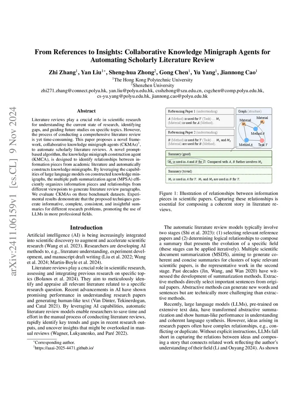 Literature reviews play a crucial role in scientific research for understanding the current state of research, identifying gaps, and guiding future studies on specific topics. However, the process of conducting a comprehensive literature review is yet time-consuming. This paper proposes a novel framework, collaborative knowledge minigraph agents (CKMAs), to automate scholarly literature reviews. A novel prompt-based algorithm, the knowledge minigraph construction agent (KMCA), is designed to identify relations between concepts from academic literature and automatically constructs knowledge minigraphs. By leveraging the capabilities of large language models on constructed knowledge minigraphs, the multiple path summarization agent (MPSA) efficiently organizes concepts and relations from different viewpoints to generate literature review paragraphs. We evaluate CKMAs on three benchmark datasets. Experimental results show the effectiveness of the proposed method, further revealing promising applications of LLMs in scientific research.