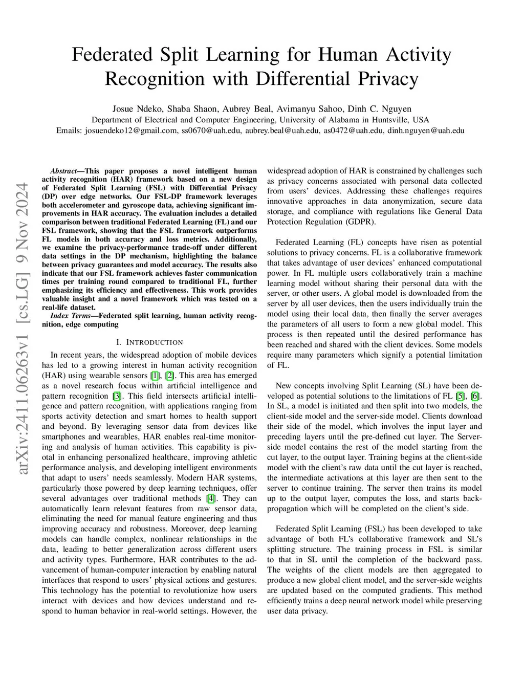 This paper proposes a novel intelligent human activity recognition (HAR) framework based on a new design of Federated Split Learning (FSL) with Differential Privacy (DP) over edge networks. Our FSL-DP framework leverages both accelerometer and gyroscope data, achieving significant improvements in HAR accuracy. The evaluation includes a detailed comparison between traditional Federated Learning (FL) and our FSL framework, showing that the FSL framework outperforms FL models in both accuracy and loss metrics. Additionally, we examine the privacy-performance trade-off under different data settings in the DP mechanism, highlighting the balance between privacy guarantees and model accuracy. The results also indicate that our FSL framework achieves faster communication times per training round compared to traditional FL, further emphasizing its efficiency and effectiveness. This work provides valuable insight and a novel framework which was tested on a real-life dataset.
