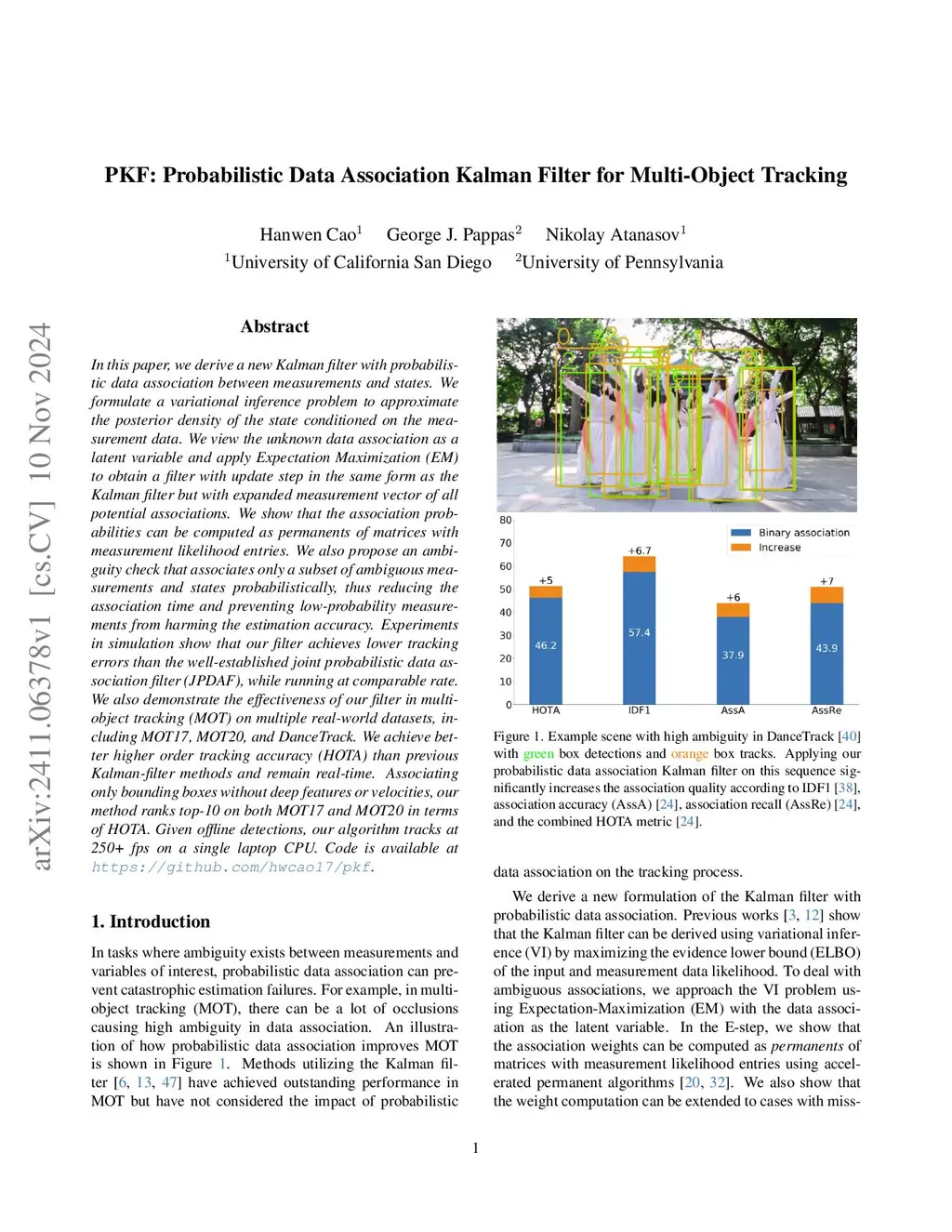 In this paper, we derive a new Kalman filter with probabilistic data association between measurements and states. We formulate a variational inference problem to approximate the posterior density of the state conditioned on the measurement data. We view the unknown data association as a latent variable and apply Expectation Maximization (EM) to obtain a filter with update step in the same form as the Kalman filter but with expanded measurement vector of all potential associations. We show that the association probabilities can be computed as permanents of matrices with measurement likelihood entries. We also propose an ambiguity check that associates only a subset of ambiguous measurements and states probabilistically, thus reducing the association time and preventing low-probability measurements from harming the estimation accuracy. Experiments in simulation show that our filter achieves lower tracking errors than the well-established joint probabilistic data association filter (JPDAF), while running at comparable rate. We also demonstrate the effectiveness of our filter in multi-object tracking (MOT) on multiple real-world datasets, including MOT17, MOT20, and DanceTrack. We achieve better higher order tracking accuracy (HOTA) than previous Kalman-filter methods and remain real-time. Associating only bounding boxes without deep features or velocities, our method ranks top-10 on both MOT17 and MOT20 in terms of HOTA. Given offline detections, our algorithm tracks at 250+ fps on a single laptop CPU. Code is available atthis https URL.