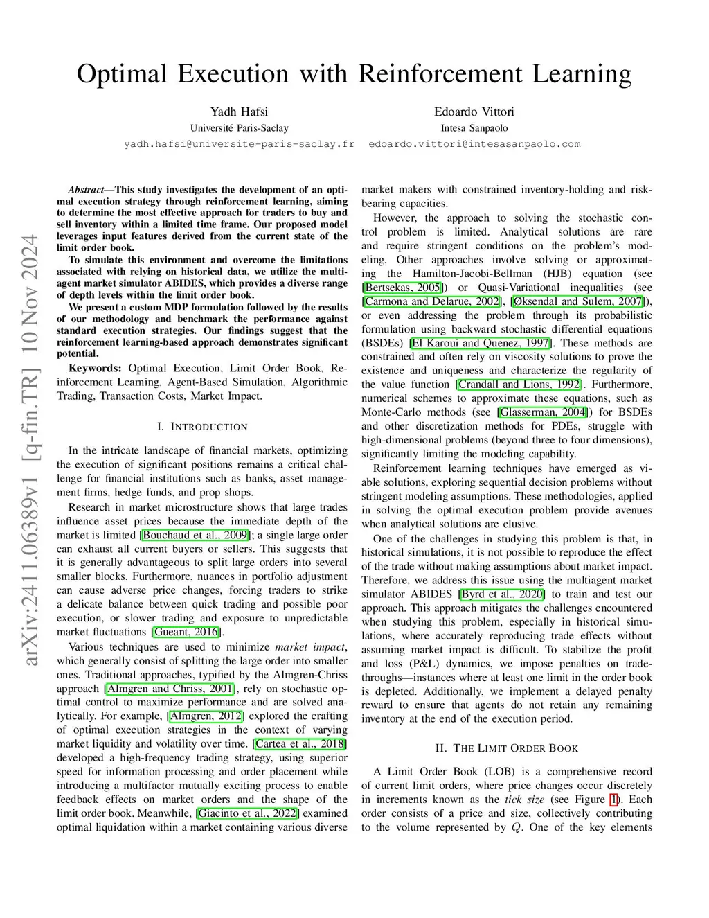 This study investigates the development of an optimal execution strategy through reinforcement learning, aiming to determine the most effective approach for traders to buy and sell inventory within a finite time horizon. Our proposed model leverages input features derived from the current state of the limit order book and operates at a high frequency to maximize control. To simulate this environment and overcome the limitations associated with relying on historical data, we utilize the multi-agent market simulator ABIDES, which provides a diverse range of depth levels within the limit order book. We present a custom MDP formulation followed by the results of our methodology and benchmark the performance against standard execution strategies. Results show that the reinforcement learning agent outperforms standard strategies and offers a practical foundation for real-world trading applications.