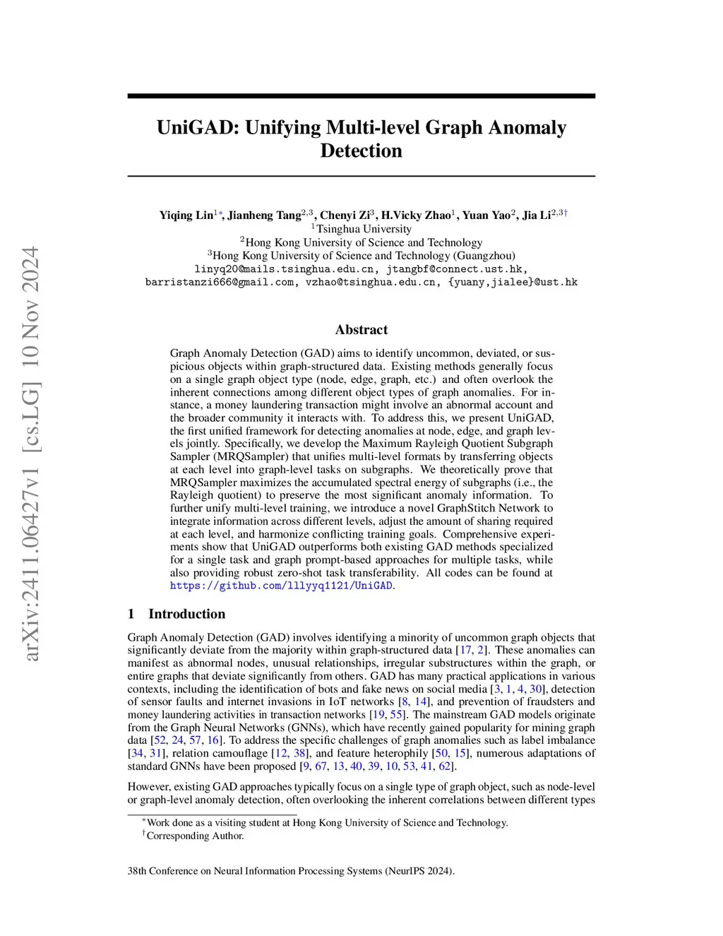 Graph Anomaly Detection (GAD) aims to identify uncommon, deviated, or suspicious objects within graph-structured data. Existing methods generally focus on a single graph object type (node, edge, graph, etc.) and often overlook the inherent connections among different object types of graph anomalies. For instance, a money laundering transaction might involve an abnormal account and the broader community it interacts with. To address this, we present UniGAD, the first unified framework for detecting anomalies at node, edge, and graph levels jointly. Specifically, we develop the Maximum Rayleigh Quotient Subgraph Sampler (MRQSampler) that unifies multi-level formats by transferring objects at each level into graph-level tasks on subgraphs. We theoretically prove that MRQSampler maximizes the accumulated spectral energy of subgraphs (i.e., the Rayleigh quotient) to preserve the most significant anomaly information. To further unify multi-level training, we introduce a novel GraphStitch Network to integrate information across different levels, adjust the amount of sharing required at each level, and harmonize conflicting training goals. Comprehensive experiments show that UniGAD outperforms both existing GAD methods specialized for a single task and graph prompt-based approaches for multiple tasks, while also providing robust zero-shot task transferability. All codes can be found at https://github.com/lllyyq1121/UniGAD.